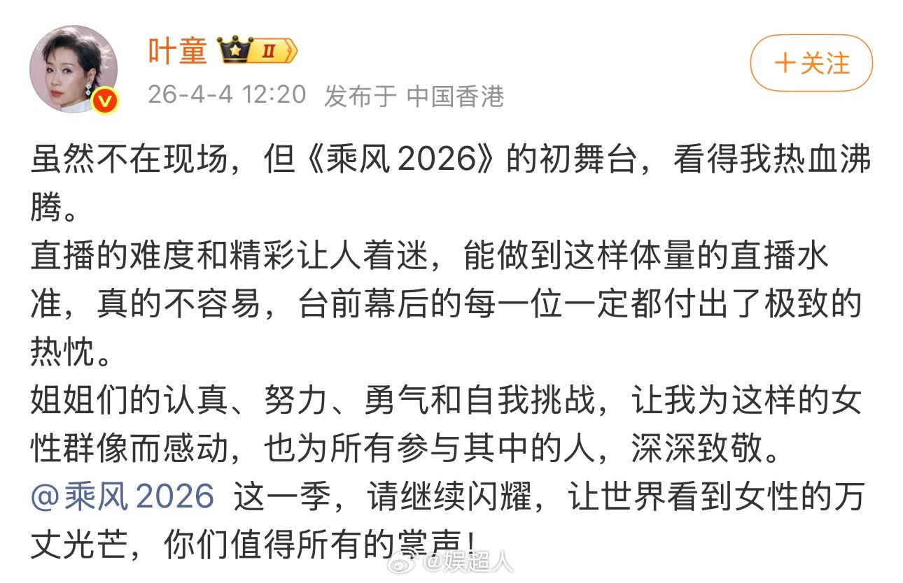 叶童也在看乘风2026叶童致敬乘风2026女性群像叶童也在看《乘风2026》!“虽然不在现场,但《乘风2026》的初舞台,看得我热血沸腾。姐姐们的认真、努力、勇气和自我挑战,让我为这样的女性群像而感动,也为所有参与其中的人,深深致敬。”