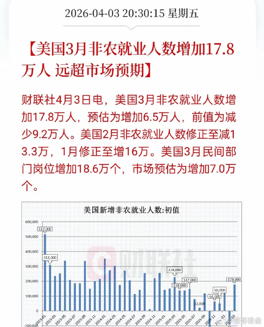 老美3月份非农增加17.8万人,远超市场预期的6.5万人。老美3月份失业率为4.3%,预估的失业率4.4%。数据发布之后,美元开启了强劲的反弹。以上的数据表明,老美的经济韧性极强。也说明了老美降息的预期在下降。 老美炸毁了伊朗的大桥,可能也是为下一步地面战做准备。以上种种事件表明伊朗局势还在继续升温。这个周末注定是不平凡的,下周一将密切关注伊朗局势的动态