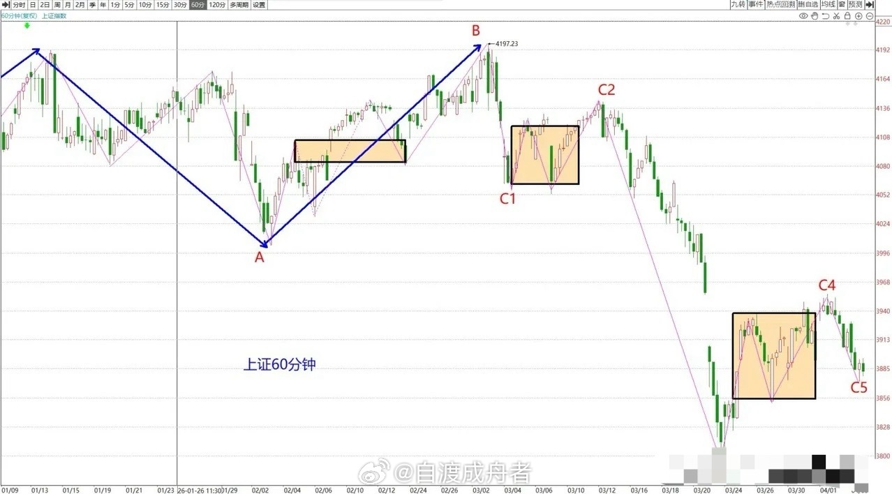 下周A股走势预判:清明小长假过后,A股究竟会延续跌势,还是迎来转折上涨呢?斯迪克判断,下周A股大概率会转折进入上升周期,从小级别来看,其高低点将逐步上移,最终收出周阳K线。从周线图分析,最近两根K线皆为十字星,其中一根带有长下影线,本周收出的十字星则带有长上影线。这显示出上下震荡极为激烈,也意味着多空双方的博弈即将收官,若下周收阳,便表明多头大获全胜。从周线底分型形态而言,属于弱势底分型,不排除后续再次形成第二个底分型。下周的走势颇为关键,若跌破3871点,但未跌破3794点,第二个底分型大概率会出现,这种双底分型结构往往预示着后市值得期待。周线反映的是中线级别的行情,若下周走势突破本周高点,就意味着接下来的超级第五浪即将开启,散户要做的就是抓住这一机遇,紧跟主力节奏,握紧筹码,把握好这波大行情。上周已在60分钟图上(见图),向大家分享了ABC调整浪的内部结构。从3794点起进入C4反弹,反弹之后的C5明确大概率不会创新低。本周来看,C5即将结束,可能会在3852点上方终结。基于上述分析,清明节假日后A股或许会进入上涨周期,但短线表现将是逐步震荡、温和上扬。再从1分钟图看,4197点以来明显走出了两个缠中说缠的走势中枢,形成了趋势下跌。当下的问题是是否存在背驰段走势,若无特别重大的利空消息,很难走出背驰段走势。影响A股市场的主要因素是中东战争及美股走势。昨晚最新消息显示,美国3月非农就业人数增加17.8万人,远超市场预期,若美股开始走强,A股还会继续弱势吗?