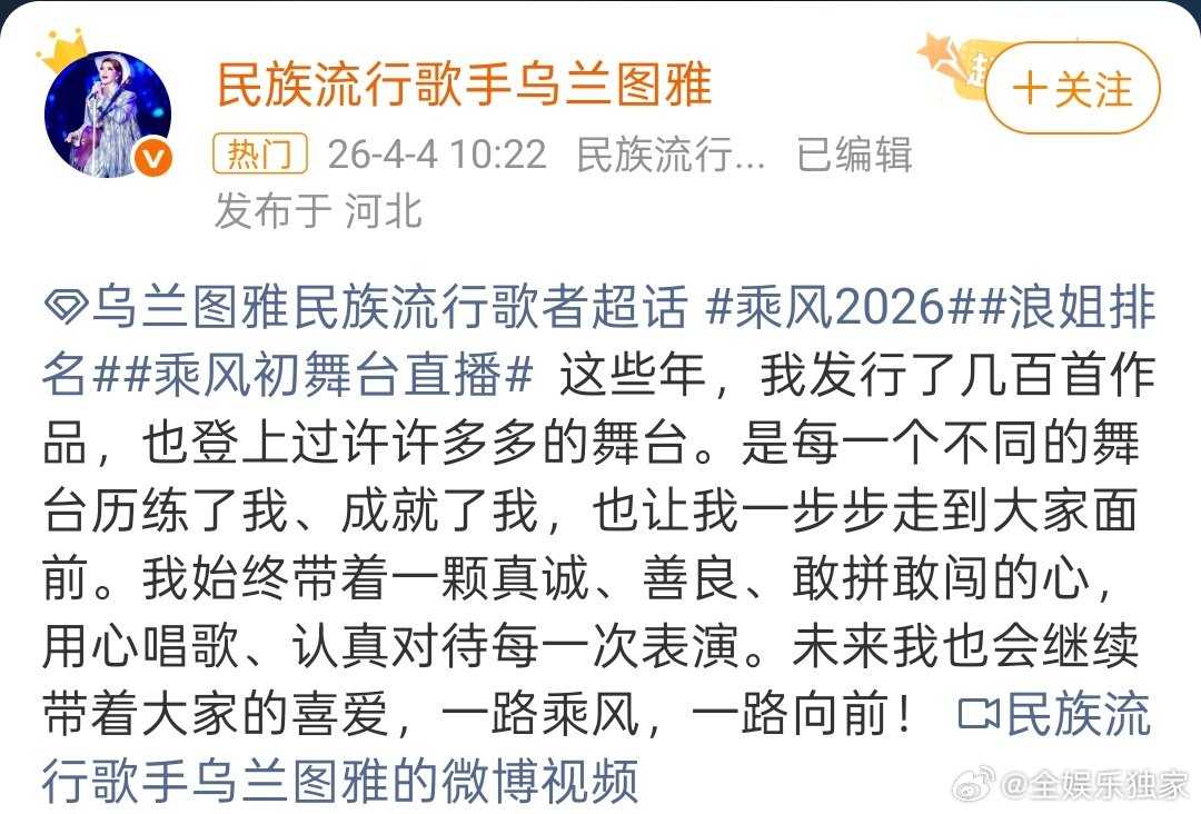 乌兰图雅回应浪姐初舞台像商演乘风热度乘风2026乌兰图雅真的太圈好感!被调侃像商演,她淡定表示舞台不分大小,用心对待每一次,态度真的超正!
