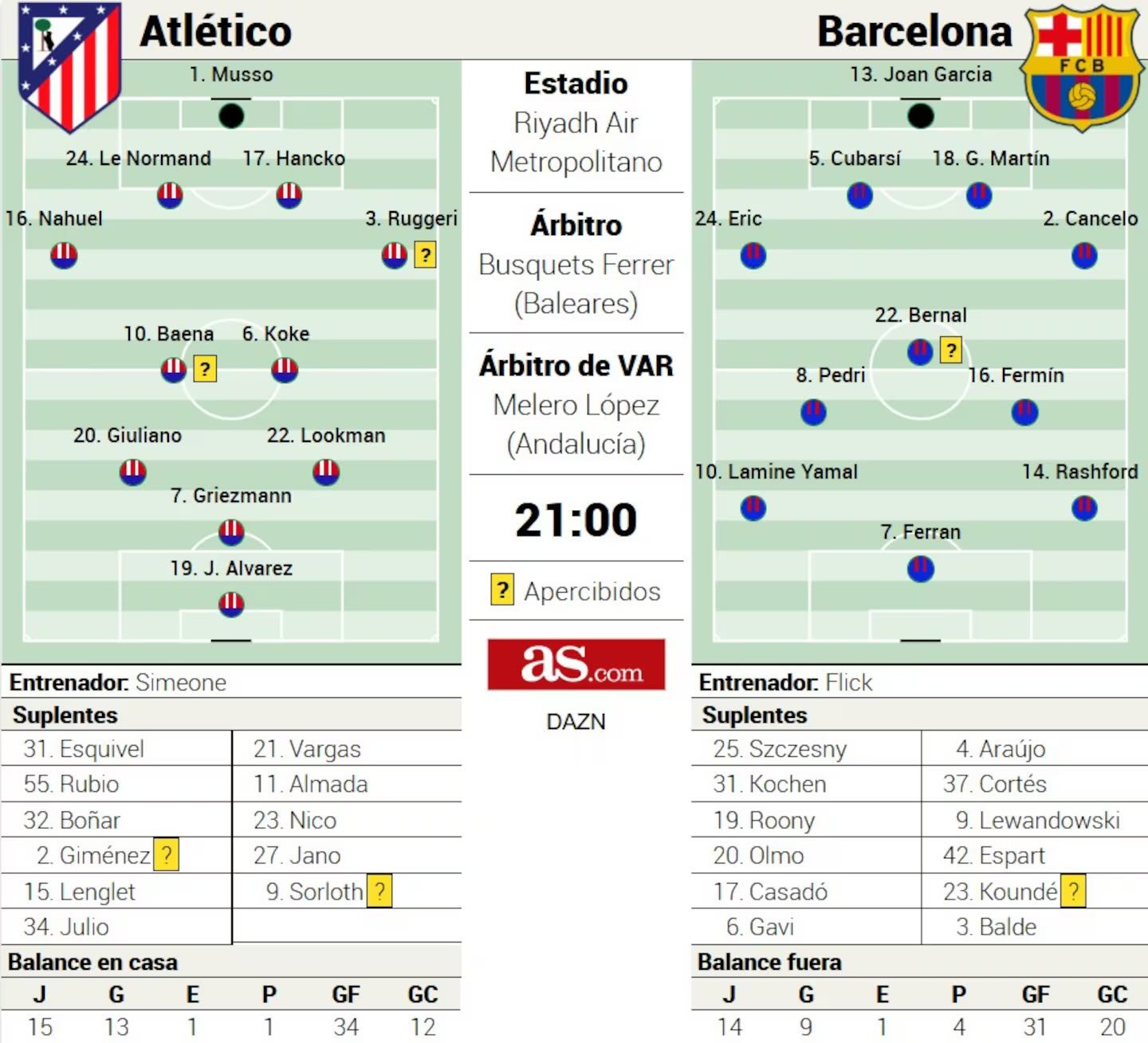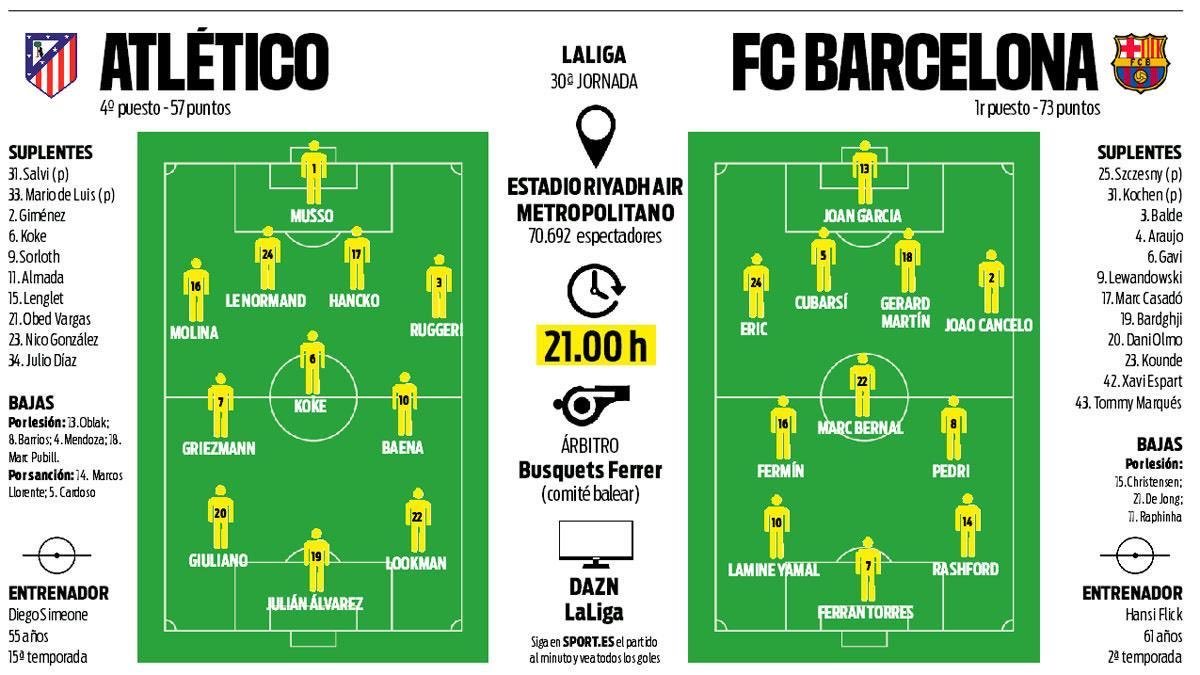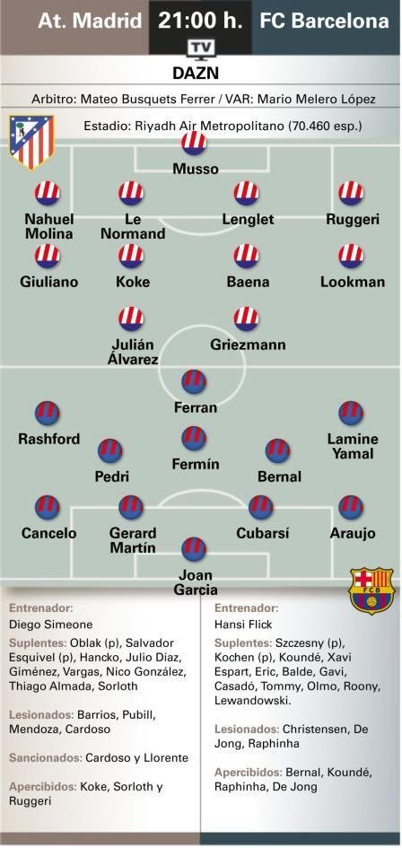 媒体预测巴萨VS马竞首发阵容,马竞奥布拉克今天无法出战。马竞vs巴萨至死不渝红蓝
