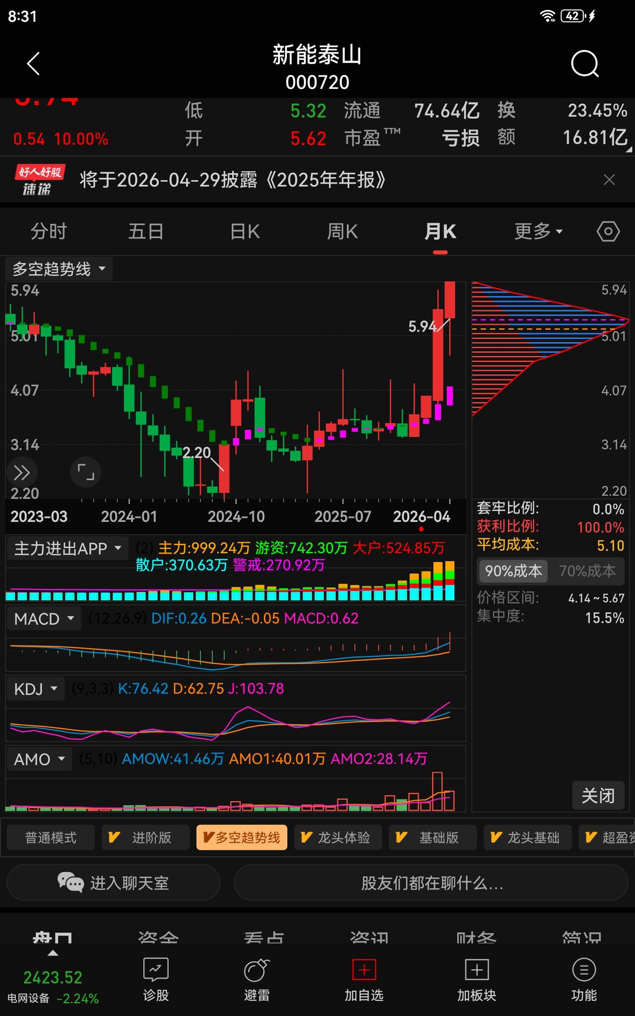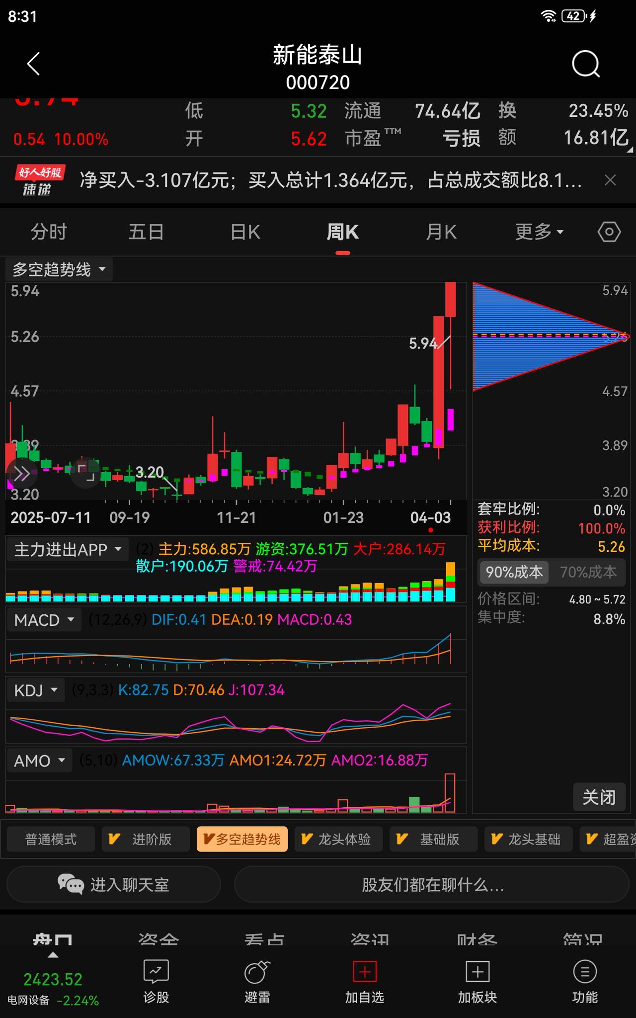 🔥妖股潜质复盘:新能泰山(000720)的筹码与趋势密码 提示:理财有风险,投资需谨慎 一、妖股候选的核心逻辑:筹码结构的极致干净 妖股的诞生,从来不是凭空而起,而是筹码结构的彻底重构。新能泰山(000720)最核心的看点,就在于其全市场罕见的零套牢盘结构。从筹码分布来看,当前套牢比例0.00%,获利比例100%,90%成本集中在3.71-5.74元区间,平均成本仅5.12元。 这意味着什么?意味着股价上方没有任何历史套牢盘的抛压,每一个价位的持有者都是盈利状态,持股心态极度稳定,为后续主升浪的启动扫清了最大障碍。这种“干净到极致”的筹码结构,正是妖股启动前的典型特征之一。 二、多周期技术面:趋势共振的强势信号 1. 日线级别:主升浪的加速阶段 日线图上,股价已经完成了从底部到高位的突破,近期持续放量上攻,换手率维持在23.45%的高活跃水平,成交额突破16.81亿,资金承接力极强。MACD指标DIF与DEA持续向上,红柱放大,KDJ指标J值接近100,显示短期多头力量完全主导,趋势处于加速上行阶段。 2. 周线级别:中长期趋势的彻底反转 周线级别上,股价完成了历史性的突破,连续大阳线拉升,彻底扭转了此前的震荡格局。周线MACD金叉向上,KDJ同步进入强势区间,成交量持续放大,确认了中长期上涨趋势的有效性,为行情的持续性提供了支撑。 3. 月线级别:大周期的底部反转确认 月线级别来看,股价从历史低位2.20元启动,当前已经走出了明确的底部反转形态,月线MACD金叉,KDJ进入强势区,成交量大幅放大,大周期级别上,一轮全新的上涨行情已经开启。 三、资金面:主力与游资的合力推动 从资金动向来看,主力、游资、大户资金呈现持续净流入的状态,散户资金占比相对较低,说明筹码高度集中在主力资金手中。这种“主力控盘+游资接力”的资金结构,正是妖股行情的典型推手,为股价的持续拉升提供了源源不断的动力。 四、妖股潜质的核心总结与风险提示 综合来看,新能泰山(000720)凭借零套牢盘的极致筹码结构、多周期共振的强势趋势、主力游资合力的资金面,完全具备了2026年妖股候选的核心特征。 但必须明确:妖股行情的本质是高波动、高风险,筹码结构的干净不代表股价会持续上涨,市场情绪的变化、资金的流向都可能引发剧烈波动。本文仅为市场信息梳理与技术面分析,不构成任何投资建议。 免责声明:本文仅为市场信息梳理与行业分析,不构成任何投资建议。市场有风险,投资须谨慎。 新能泰山 下一个妖股预言 @时光记忆WGW