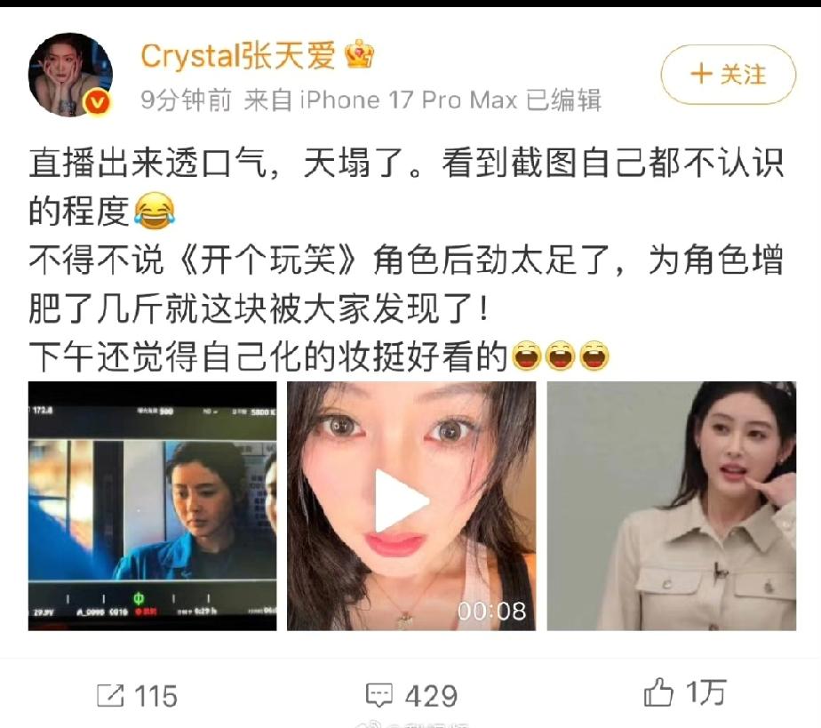 张天爱参加浪姐大变样被网友质疑医美,本人出来回应是因为新剧增肥了,所以看着和以往的她有点不太一样。 张天爱在上浪姐之前在拍摄新电影《开个玩笑》,里面她饰演环卫工人季红,为了更贴合角色,她主动增肥。 脸确实看着明显圆润了很多,还有了苹果肌,法令纹也变少了,她强调自己没有医美,就是增肥了而已。 其实张天爱并没有医美,只是以往她太瘦了,所以这次猛的胖了这么多,就给人一种大变样的感觉。 以前为了好身材,她的体重一直都在90斤左右浮动,身材偏属于瘦削,现在增肥了几斤,脸上都有肉了,与之前有巨大的反差,难怪会被人认为医美了,因为变化确实有点大。