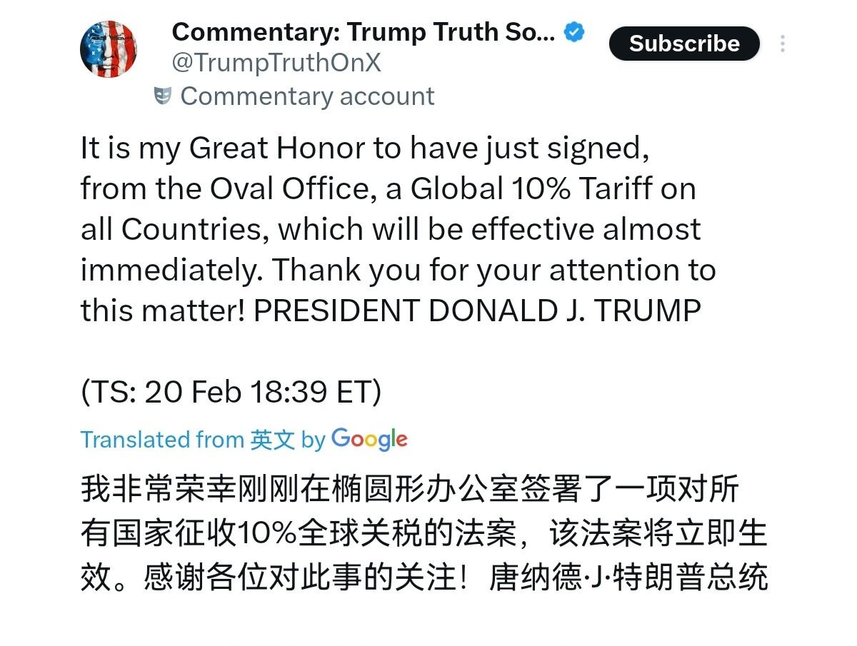 美国的一巴掌,扇晕了刚刚与美国达成协议的高市早苗! 2月21日,特朗普声称,我非常荣幸地刚刚在椭圆形办公室签署了一项对所有国家征收10%全球关税的法案,该法案几乎将立即生效。感谢您对此事的关注!很显然,特朗普的这一宣布,说明什么呢?这充分说明一点,单方面对美国妥协,对美国大让步换取的协议,美国说废弃就废弃。 这一巴掌,扇得最疼的莫过于日本首相高市早苗。 就在几天前,这位日本首相还在为和美国达成的协议沾沾自喜,以为靠着“投名状”就能换来关税减免的护身符。 2月18日,特朗普刚昭告天下,美日巨额贸易协议正式启动,日本承诺拿出首批360亿美元投向美国三大能源项目,还定下死规矩:45天内不到账,美对日关税就直接恢复25%。为了这张“免死金牌”,高市早苗可是下了血本,整个日本都知道,她这是在赌上国家利益换一时安稳。 可谁能想到,特朗普的翻脸速度比翻书还快。2月20日,美国最高法院刚裁定他之前的大规模关税政策“越权”,转头他就签署新行政令,依据《1974年贸易法》第122条,对所有国家加征10%进口关税,还特意强调“几乎立即生效”。 更狠的是,2月21日他又在社交平台加码,直接把税率提到15%,同样“立即生效”。这哪里是什么关税减免,分明是把日本的承诺当废纸,把盟友的信任当筹码。 高市早苗的“谄媚外交”,在这一刻彻底成了笑话。为了讨好美国,她在3月访美时献上730亿美元的对美投资“大礼包”,这些钱砸进美国的核反应堆和天然气发电项目,投资和收益却极不合理,连日本国内都骂她“卑躬屈膝”。 她以为用真金白银就能换来美国的特殊对待,却忘了特朗普的“美国优先”从来没有例外,不管是盟友还是伙伴,只要不符合美国利益,说翻脸就翻脸。 日本企业最先感受到了刺骨的寒意。 特朗普的关税政策一落地,日本对美出口就开始跳水,2月对美出口额同比下降8%,已经连续3个月下滑,其中医药出口暴跌58.1%,汽车和汽车零部件也分别下降14.8%和15.9%。 至少10家日本公司,包括川崎重工、丰田通商这些巨头,已经向美国国际贸易法院提起诉讼,要求退还税款,因为他们知道,再等下去只会亏得更惨。 日本政界的批评声也越来越响。自民党政调会长小野寺五典直接公开指责,特朗普的做法“毫无道理可言”,还警告说,美国这种政策混乱的做法,会让国际社会加速远离美国。日本经济团体联合会会长筒井义信也表示,美国关税政策的不确定性,让企业经营环境变得不透明,投资判断的风险大大增加。高市早苗当初拍胸脯换来的协议,现在成了她最大的政治包袱。 这不是美国第一次对盟友“出尔反尔”。此前已经和美国达成协议的英国、韩国、欧盟国家,如今都面临着同样的困境,原本承诺的关税优惠被一纸行政令推翻,不得不支付更高的关税。新加坡、澳大利亚这些原本适用10%基准关税的国家,也被纳入了15%的征税范围,美国的关税大棒,不分盟友还是伙伴,一视同仁地砸了下去。 特朗普的这波操作,本质上就是用关税当工具,搞单边主义霸凌。他先是被最高法院裁定政策违法,转头就换个法律依据“换皮”加征关税,既无视国际规则,也不顾全球贸易秩序。这种做法让全球贸易不确定性急剧上升,企业不得不不断调整合规安排,额外增加的成本最后都转嫁给了普通消费者。 对高市早苗来说,这一巴掌不仅打在了脸上,更打在了日本外交的根基上。她以为靠妥协让步就能维护日美同盟,却没想到美国眼里只有利益,没有所谓的“盟友情谊”。 日本为了讨好美国,付出了巨额投资成本,换来的却是关税飙升、出口下滑的恶果,这哪里是什么同盟保障,分明是被美国当“提款机”收割。 放眼全球,美国的全球关税政策已经引发了连锁反应。 欧盟一边重启欧美贸易协议批准进程,一边引入“日落条款”等防护机制,生怕再被美国坑一把;全球南方国家也纷纷发声,呼吁用多边主义对抗单边霸凌,以团结应对美国的贸易霸权。 越来越多国家意识到,对美国单方面妥协换不来安全,只有抱团取暖、坚守规则,才能抵御美国的贸易霸凌。 高市早苗的遭遇,给所有国家都上了一课:在大国博弈中,靠妥协换和平根本行不通,美国的承诺从来没有保障。 想要维护自身利益,不能寄希望于美国的“恩赐”,而要靠自己的实力,靠多边合作,靠坚守国际规则。 美国的关税大棒虽然暂时嚣张,但单边主义终究不得人心,全球贸易秩序的重建,只是时间问题。