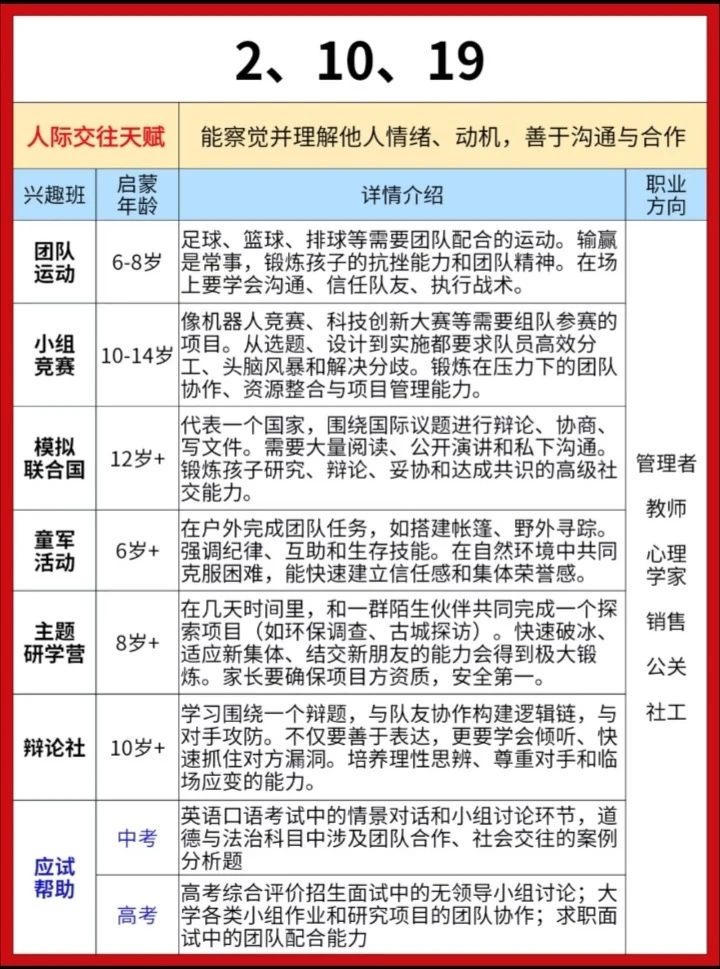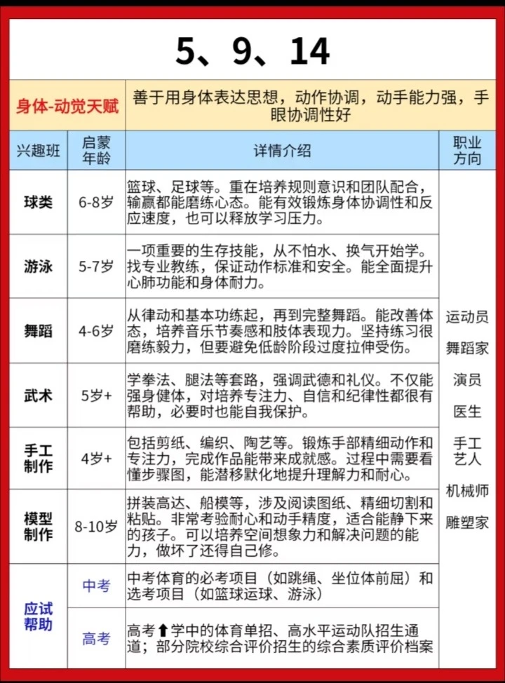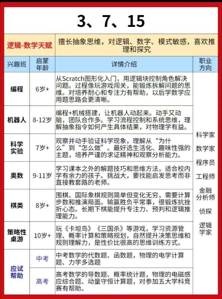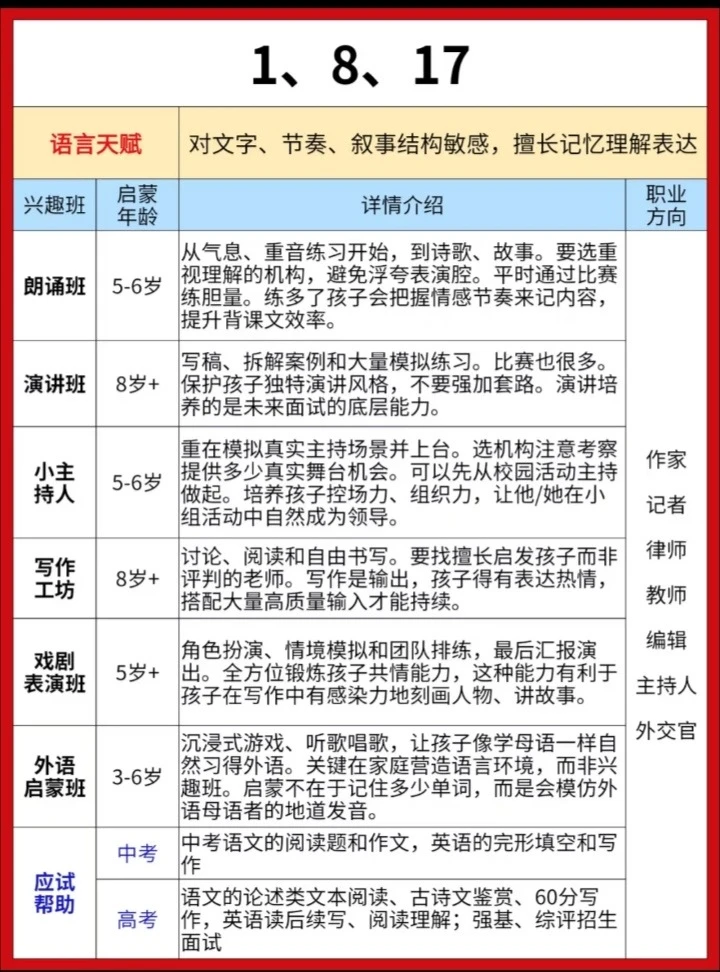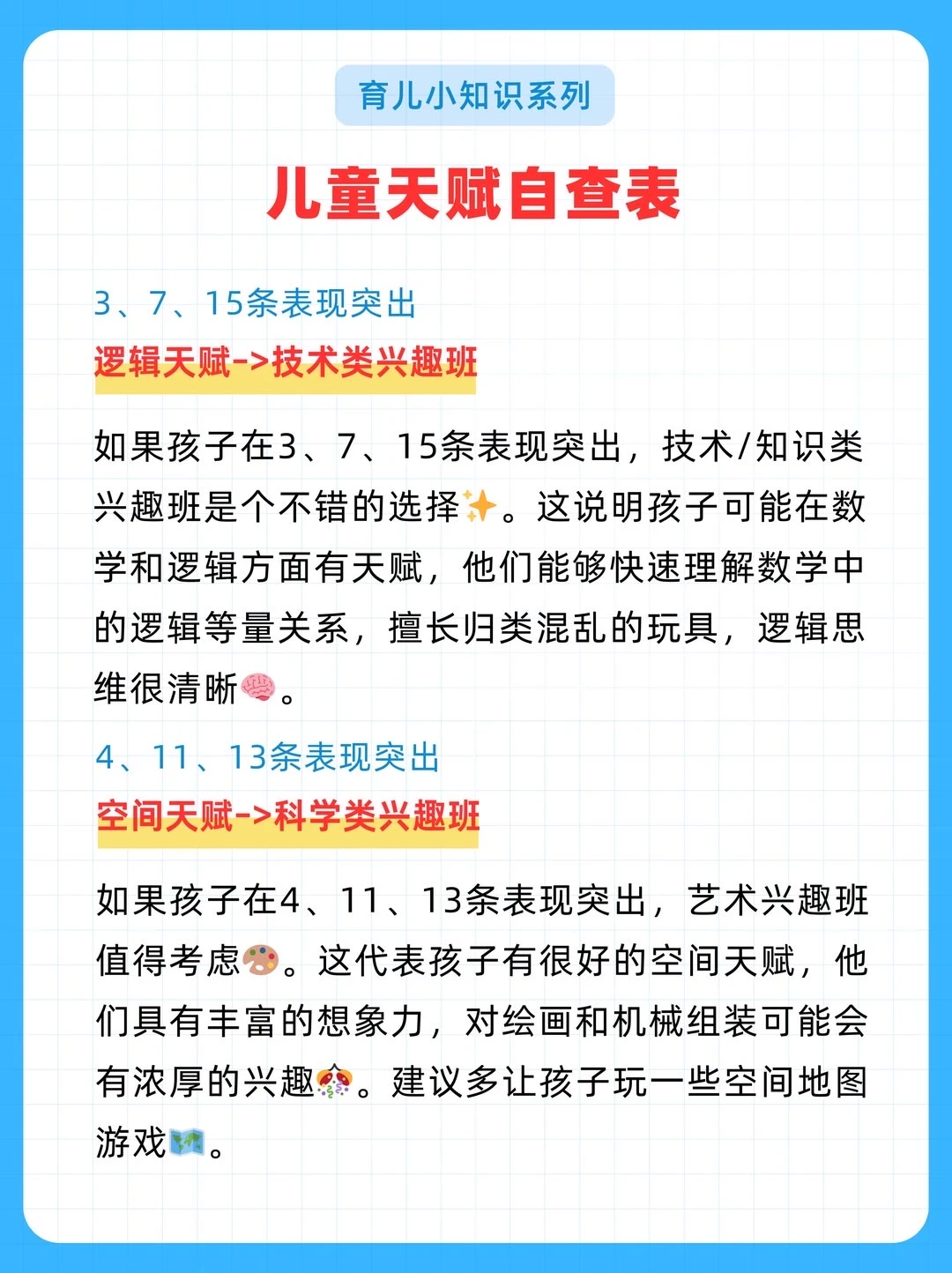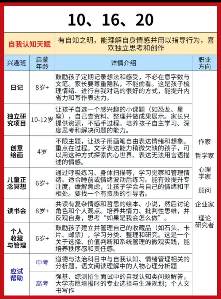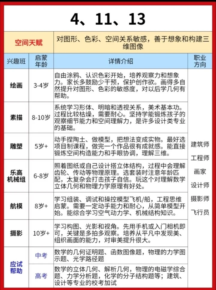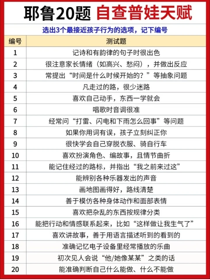 给大家分享一份耶鲁大学研发的《儿童天赋自查表》,不是测智商,而是从日常细节读懂孩子潜能。 20个生活化问题,覆盖7大智能领域。 5分钟,帮你看见孩子藏在言行里的闪光点。 因材施教,让每一种天赋都不被埋没。 ✅ 全面涵盖语言、音乐、交际、逻辑、空间、运动、艺术等多方面天赋判断 ✅ 通过日常行为分析,帮助家长发现孩子潜在天赋,科学选兴趣班 ✅ 附兴趣班推荐、职业方向、适合年龄等详细说明,实用性强 ✅实用:2-7岁适用,精准定位天赋方向 ‼️测评结果仅供参考,还是以孩子实际发展情况为准。
