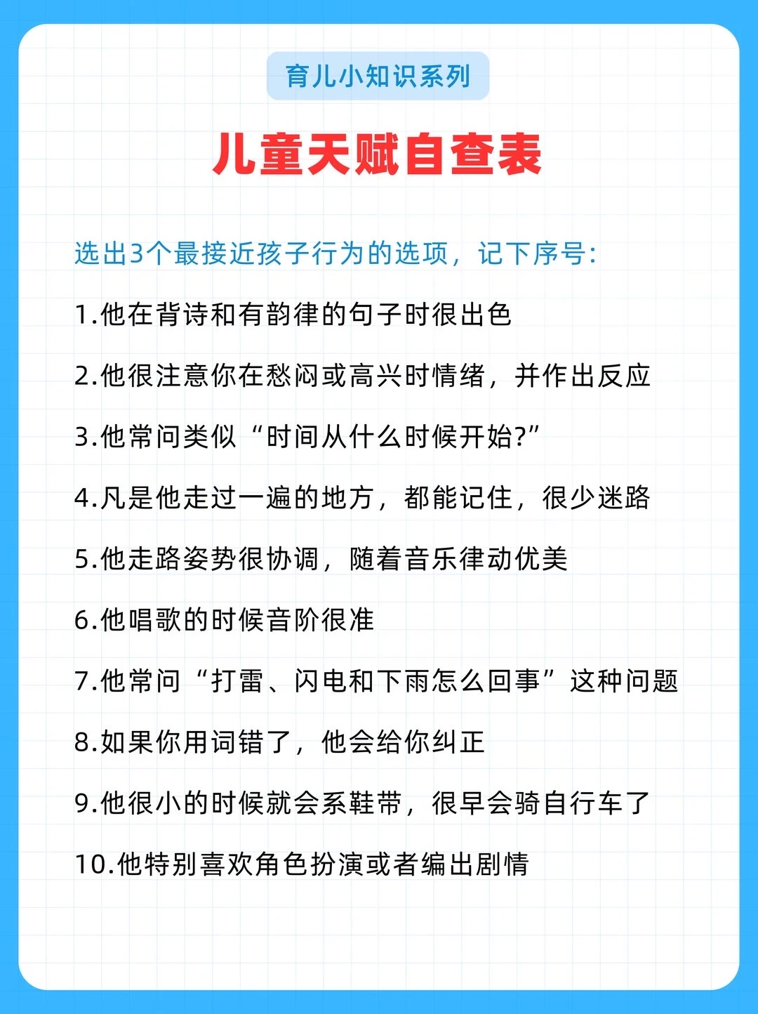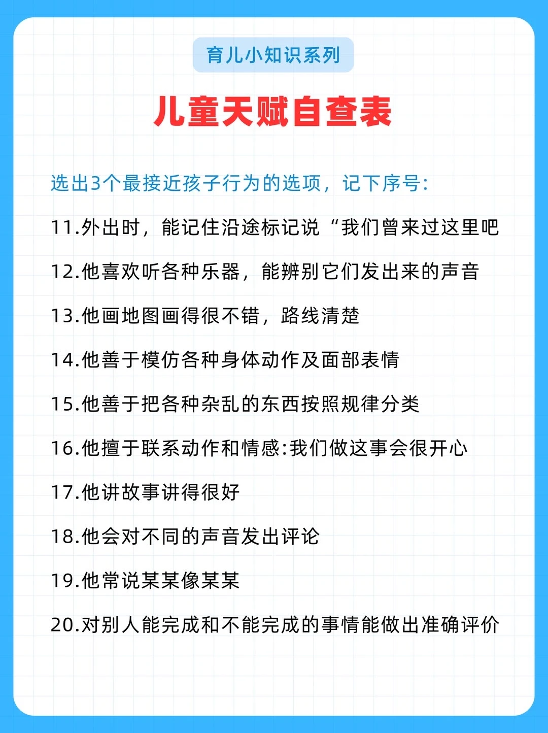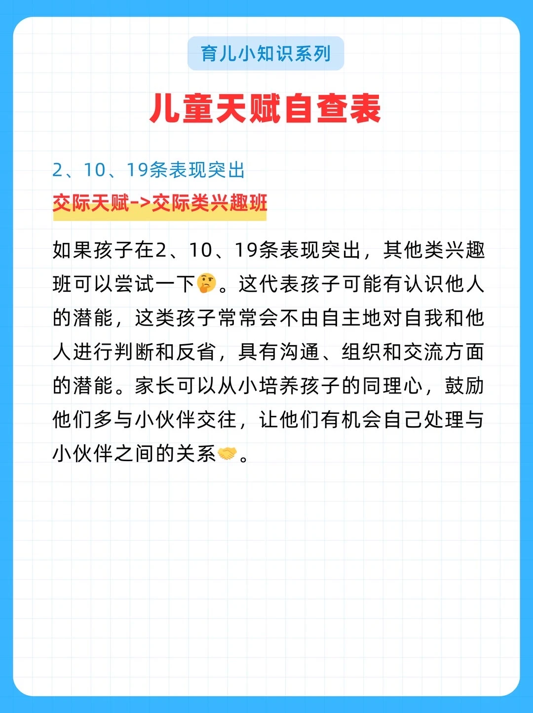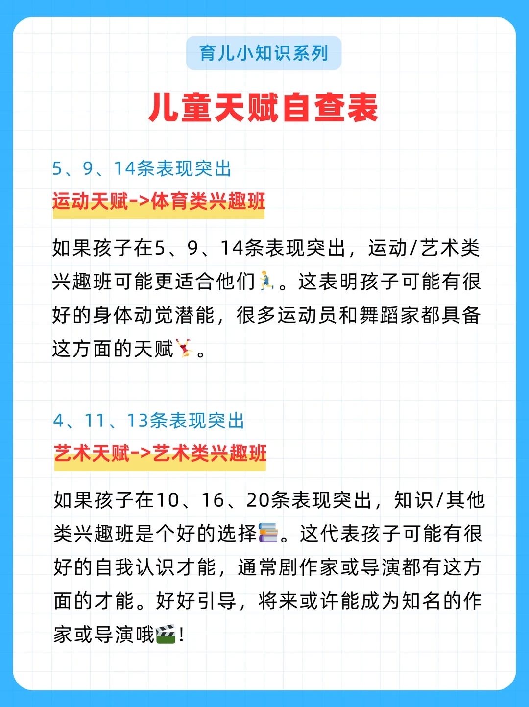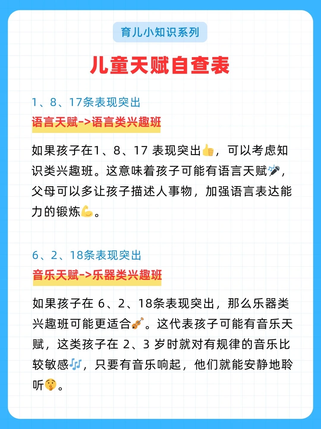 给大家分享一份耶鲁大学研发的《儿童天赋自查表》,不是测智商,而是从日常细节读懂孩子潜能。 20个生活化问题,覆盖7大智能领域。 5分钟,帮你看见孩子藏在言行里的闪光点。 因材施教,让每一种天赋都不被埋没。 ✅ 全面涵盖语言、音乐、交际、逻辑、空间、运动、艺术等多方面天赋判断 ✅ 通过日常行为分析,帮助家长发现孩子潜在天赋,科学选兴趣班 ✅ 附兴趣班推荐、职业方向、适合年龄等详细说明,实用性强 ✅实用:2-7岁适用,精准定位天赋方向 ‼️测评结果仅供参考,还是以孩子实际发展情况为准。