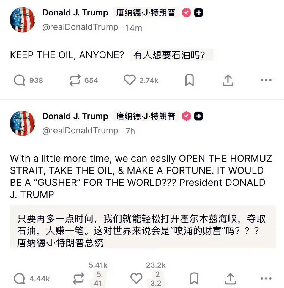 特朗普一边嘴硬说不需要霍尔木兹海峡,一边又鼓动那些依赖该海峡进口石油的国家,要么从美国买石油,要么自己去“抢石油”,说白了,就是自己搞不定伊朗,又怕油价继续飙升影响自己的选举,只能急着找下家接盘。