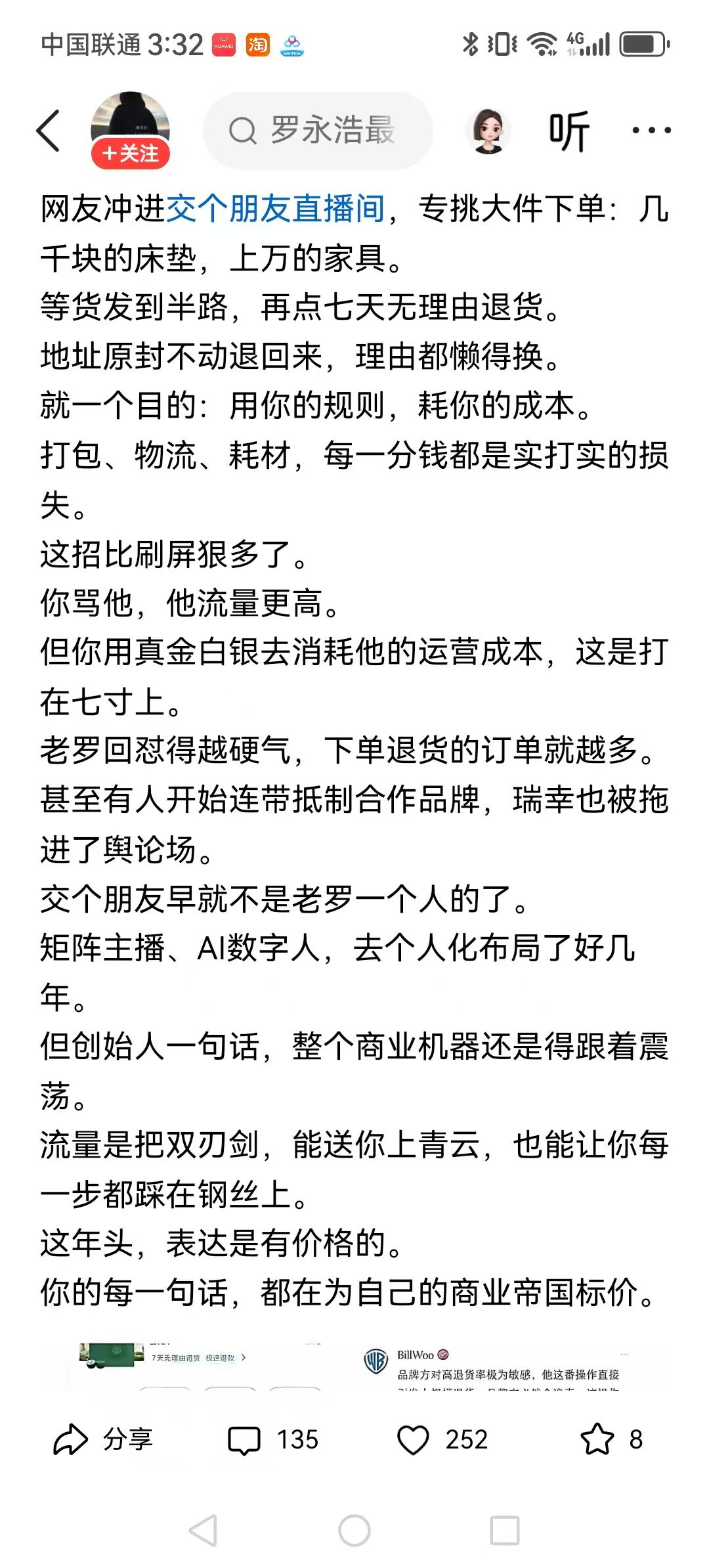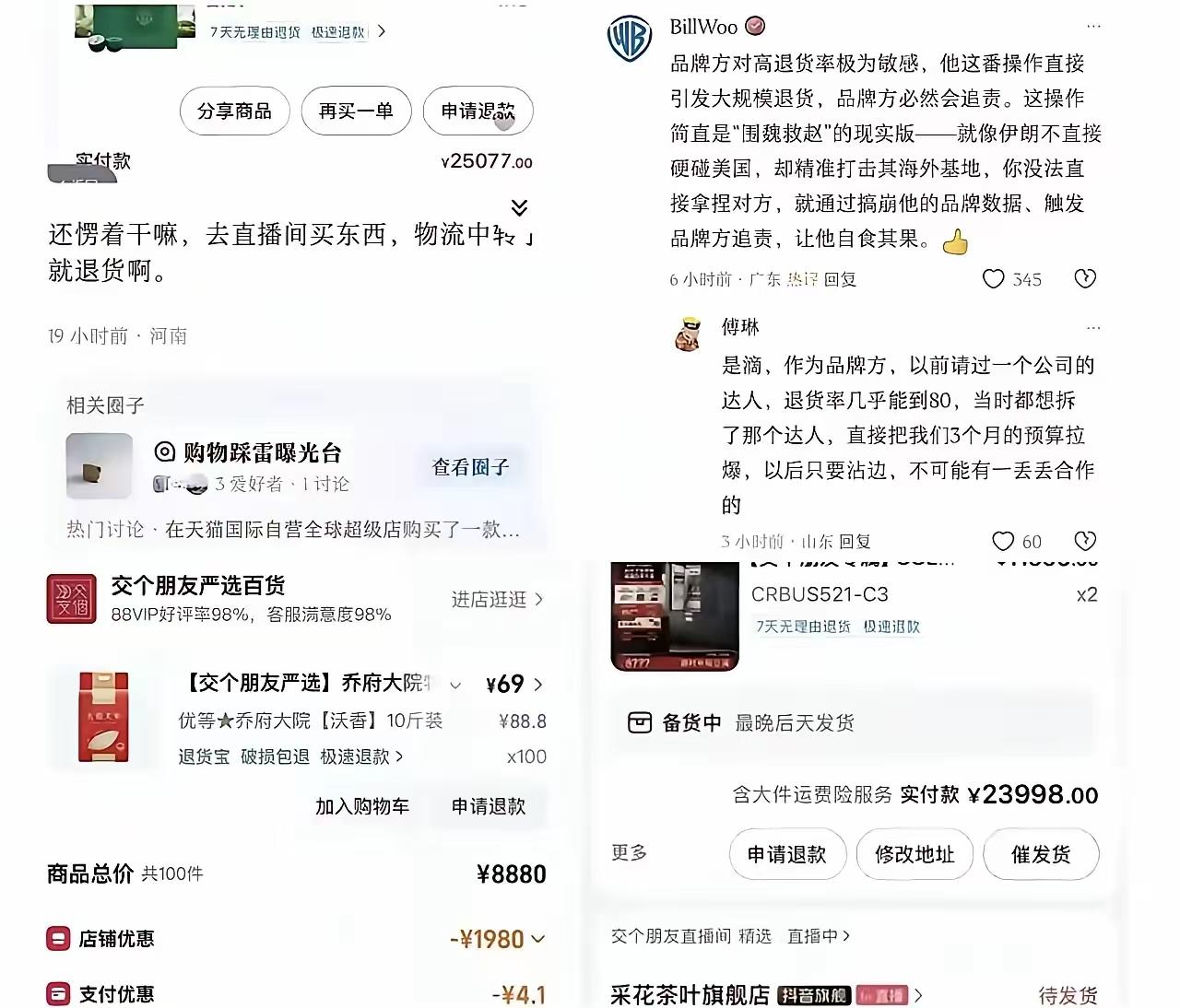 作为仅关注5天的新粉丝,己经下8单!都是物流中转后马上退货退款。听说到了驿站再拒收的话,他们损失更大。 这不是退货,这是一种艺术行为。大件拒收成本通常400元,签收退货一般是运费险承担。 现在看来,那些买东西帮老罗还账的人,都应该后悔了。老罗欠的钱没还完之前还能夹着尾巴,现在放飞自我,露出本性了。 宁愿得罪君子也不要得罪小人,罗永浩不懂这个道理。 罗永浩不是号称初代网红,大家就用互联网的方式教他做人,让他知道什么叫水能载舟亦能覆舟。 除非瑞信和这货切割,否则抵制瑞信。不喝咖啡会死吗?要让他的金主都感到痛,罗永浩才会痛。 这人虽然也讲真话,但是,人品不敢恭维。罗太君当年就是这个样子的,这几年只是在还债,所以没时间表现出来,现在是无债一身轻,所以表现出来了!