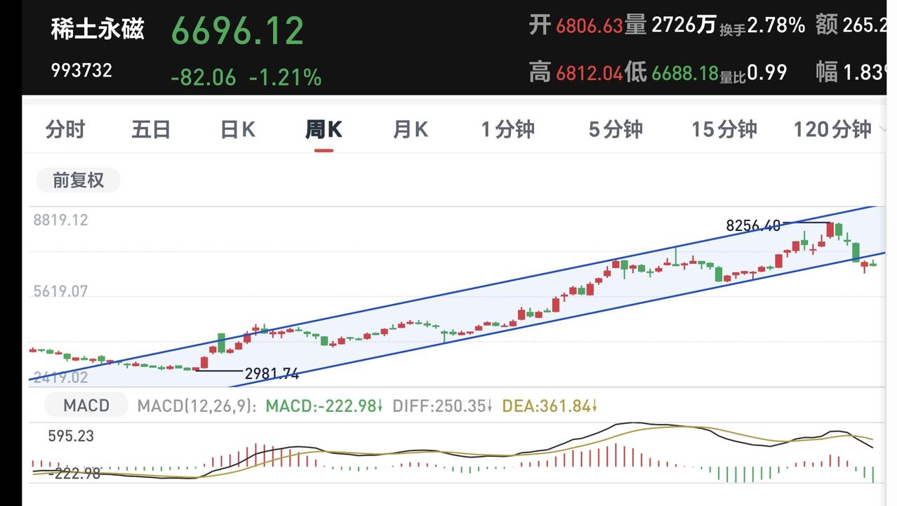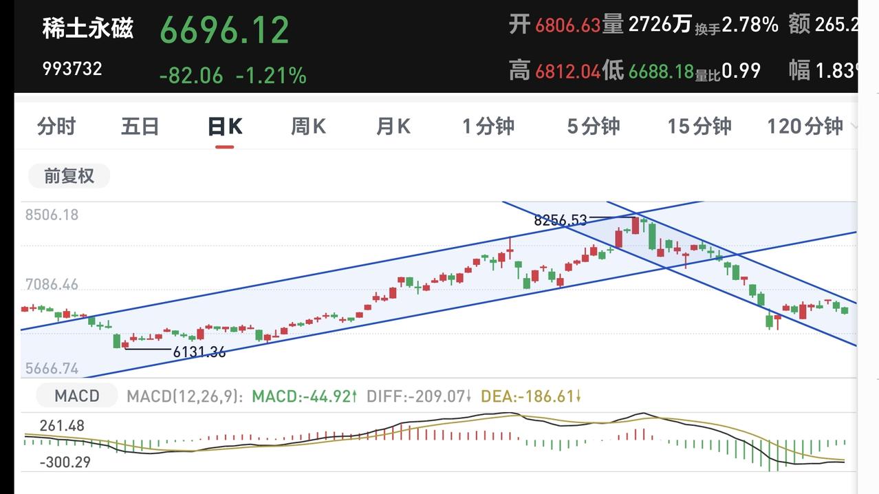 基金:稀土永磁板块的进场点和离场点 稀土永磁板块上周五下跌了1.08%,是连续第二个交易日下跌,持有人数在所有板块当中排名第4位,散户人数也是比较多。 稀土永磁板块近一个月以来下跌了13.36%,近三个月以来上涨了4.29%,近六个月以来上涨了14.06%,近一年以来上涨了76.59%,近三年以来上涨了51.78%,这个板块有6只基金,各只基金的情况见下面的截图7。 稀土泳池板块下跌跌破日线级别上涨通道下轨线以后,形成了一个日线级别的短期下跌通道,最近一段时间都是在这个下跌通道中运行,在上涨突破这个下跌通道上轨线之前,都不要轻易判断这个板块的调整已经结束。 稀土永磁板块周线级别处于上涨趋势破位中,最近的两周都是在这个上涨通道的下方震荡,形成了有效破位,长线持有的人需要注意风险。 稀土永磁板块的离场点,是在跌破日线级别上涨通道下轨线的时候,形成下跌趋势之后,就应该进行观望,现在的状态应该是处于观望中,下一个进场点是在上涨突破日线级别短期下跌通道上轨线的时候,再考虑要不要进场。 许多人想不通的是,这个板块的离场点为什么不是8256点的时候(见下面的截图8),而是在更低的位置,也就是跌破日线级别上涨通道下轨线的时候,这是因为:在8256点的时候,上涨到了日线级别上涨通道上轨线附近,那个地方还是处于上涨趋势中,只是已经接近了上涨通道的上轨线,可以继续持有,但不建议进场,那个地方你不知道是不是会继续上涨,那个地方你不知道将来会跌破上涨通道的下轨线,而跌破了上涨通道下轨线以后,才表明了原来的上涨趋势已经被改变,所以,要在跌破上涨通道下轨线的时候离场,而不能在8256点的地方离场,在8256点的地方离场没有确定性,在跌破上涨通道下轨线之后的离场才有确定性,这段内容看明白了的人,理解透彻了的人,在评论区讲一下。 没有人能够精准的在最高点离场,只能是在相对确定性的高位区域离场,没有人能够精准的在最低点进场,只能是在相对确定性的低位区域进场,高位区域离场以后,在将来看,早一天离场和晚一天离场没有区别,低位区域进场以后,在将来看,早一天进场和晚一天进场没有区别。 我写文章请大家过来欣赏,许多人看了以后,什么痕迹都没有留下,走的时候也是一声不吭,连一个点赞,连一句评论都不会留下,走的是那样的无声无息,这样的人是不地道的,没有做人最起码的准则,我不愿意与这样的人交朋友。