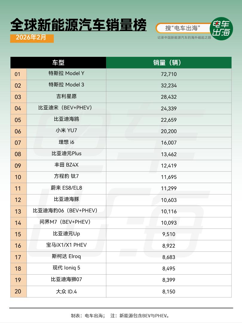 2月全球电动车销量同比下滑,大概-11%,算是最近几年少见的回调。主要还是补贴退坡+中国市场短期调整的影响。 销量在波动,但格局基本没动。 比亚迪还是第一,特斯拉在回升,吉利也稳在前排,大众、宝马这些传统车企,慢慢又追上来了。 起亚冲到了前六,算是这轮里的一个亮点。
