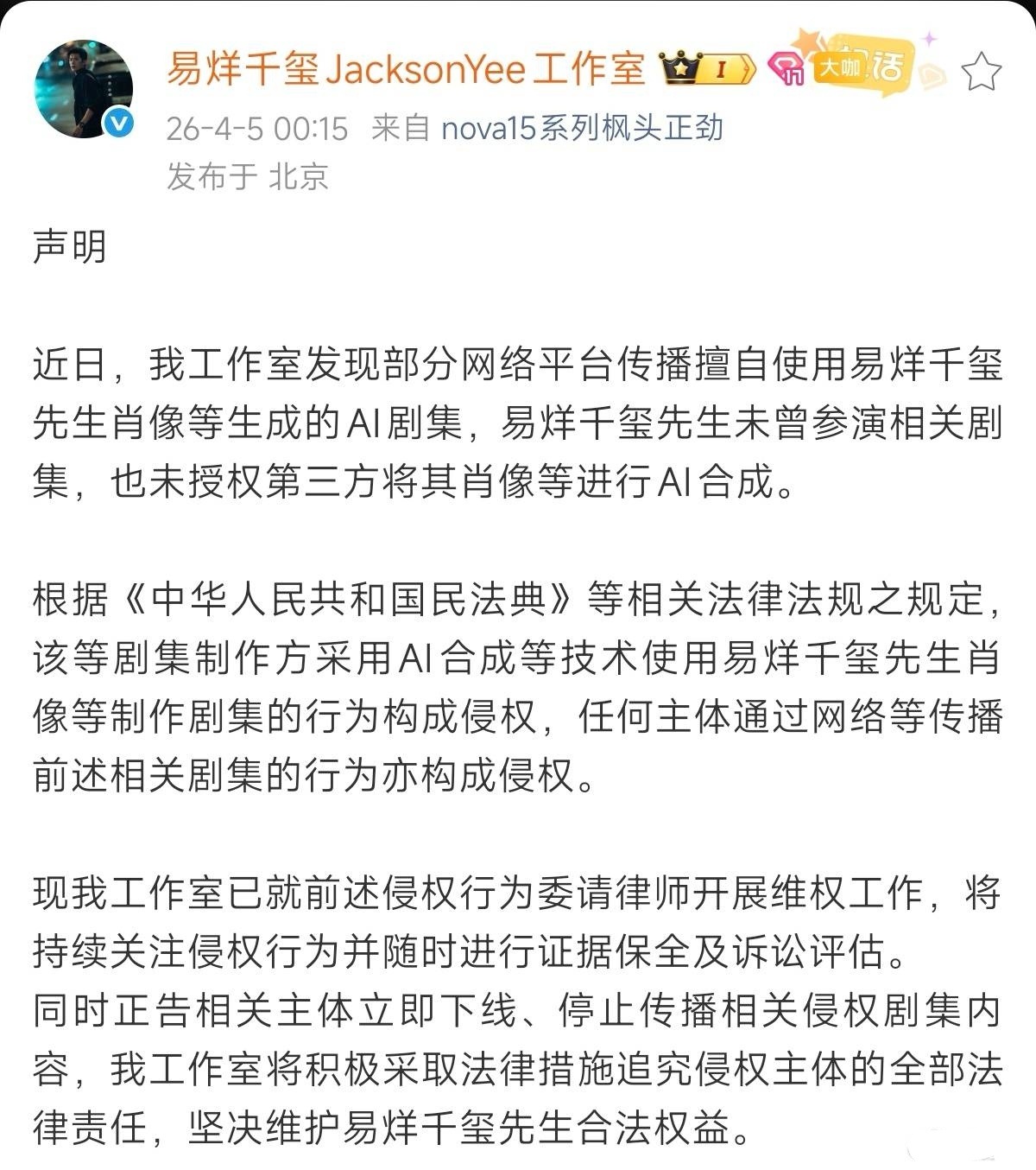 易烊千玺工作室回应被AI换脸易烊千玺工作室发布声明,指部分平台AI短剧未经授权合成其肖像声音,已委托律师维权,将依法追责、坚决维护合法权益 。
