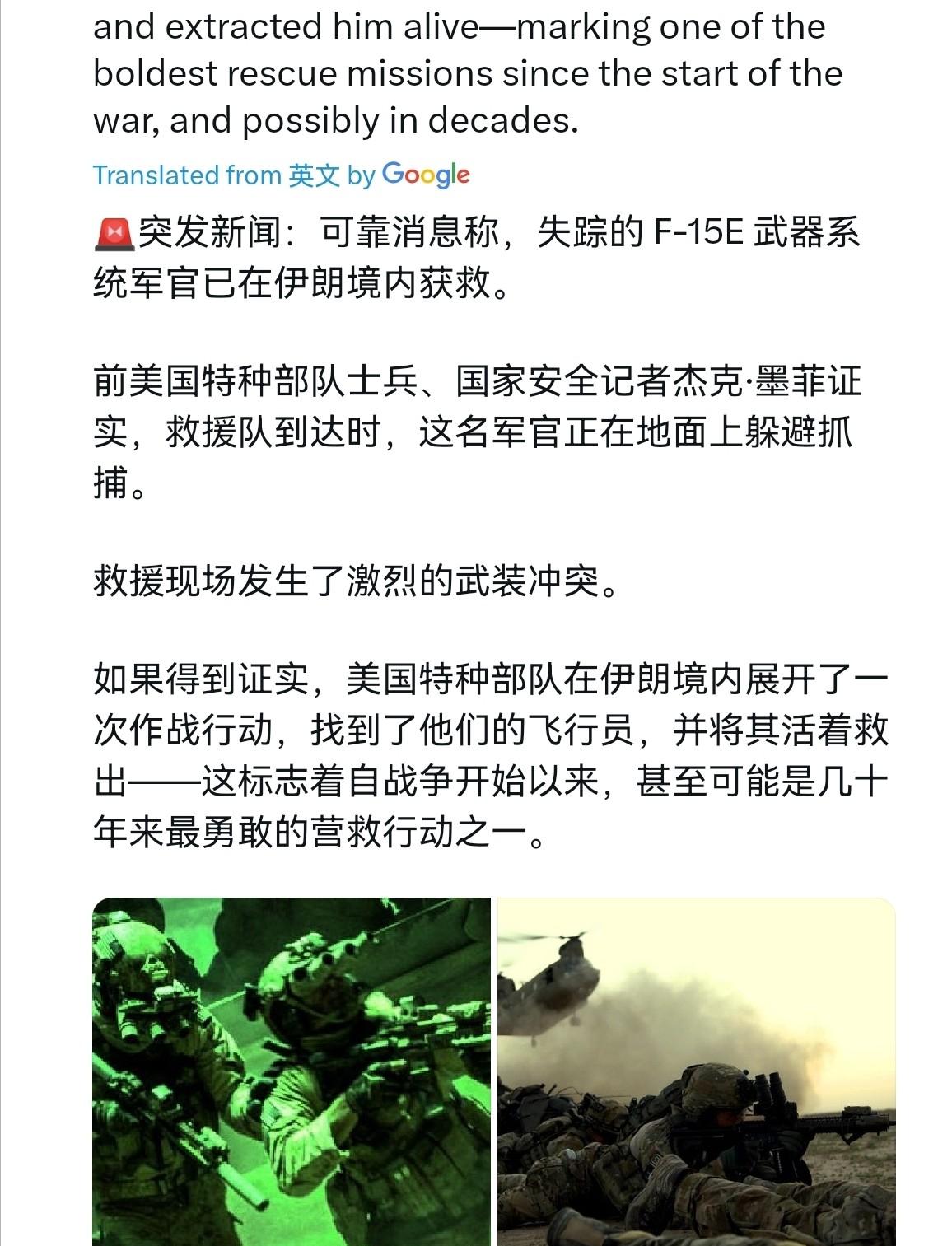 有消息称,美国飞行员已经被救出!4月5日,外媒报道称,失踪的F-15E飞行员已从伊朗境内获救。前美国特种部队士兵和国家安全记者杰克·墨菲证实,当救援队到达时,这名军官正在逃避地面上的捕获。救援现场发生了激烈的武装冲突。外媒表示,如果得到证实,这将是美国特种部队在伊朗境内自战争开始以来最大胆的救援任务之一,可能是几十年内最大胆的一次。