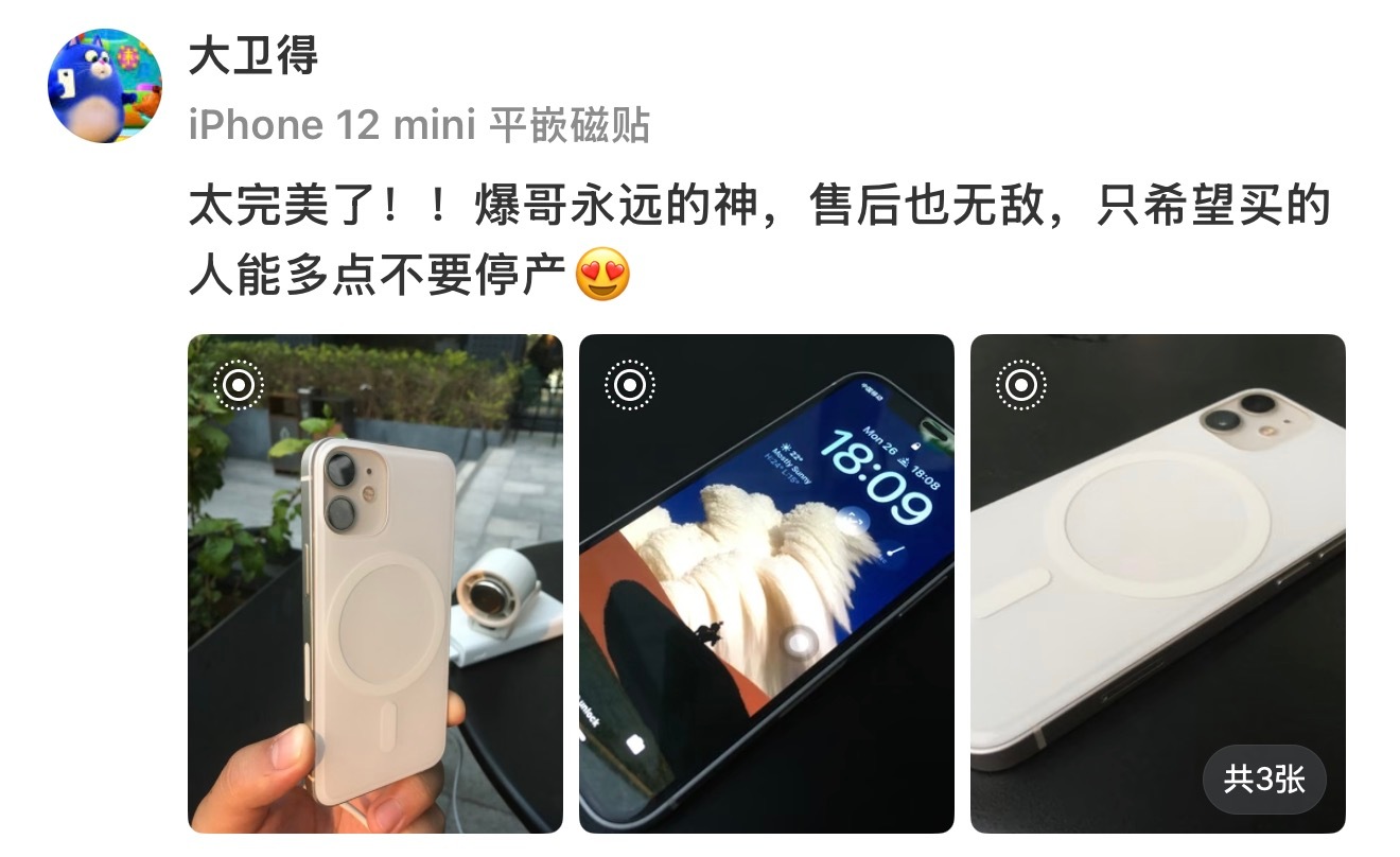 12mini 平嵌磁贴加上后,像换了个新皮肤CNC 精雕,侧边大弧度握持舒服。自带磁吸,贴上后提供比裸机更强的磁吸力,宛若新机