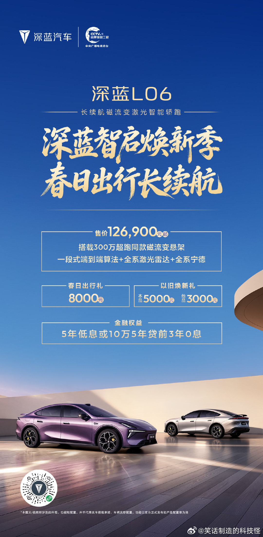 深蓝L06三月销量环比达百分之170解锁行业加速度!深蓝汽车3月全球销量再创新高,达31742辆,同比增长30%、环比增长87.8%,以双增长态势在新能源赛道中强势领跑,彰显出强劲的品牌竞争力。其中,深蓝L06表现亮眼,3月单月销量5135辆,环比增长170%,实现销量跨越式增长,成为拉动品牌增长的新核心力量,展现出惊人的市场爆发力。作为细分市场的潜力股,深蓝L06不仅斩获央视“年度操控车型”权威背书,更收获了海量用户的认可与信赖。3月以来,车主自发组织跑山打卡、挑战金卡纳+断桥飞坡+竞速漂移极限驾控项目、全国7城联动驾控体验等活动,用真实驾乘体验传递车型极致操控优势;线上全民共创车衣潮改大赛火热出圈,进一步强化了车型高颜值、年轻化的产品标签,形成了良好的传播效应,充分体现了用户对产品的高度关注与认可。与此同时,深蓝汽车以用户为核心,推出春日购车政策,将实实在在的福利转化为用户可感知的收益,持续降低购车门槛。从产品实力到用户口碑,从品牌增长到行业影响力,深蓝L06稳步向轿车市场新爆款迈进,为行业发展注入新活力。(