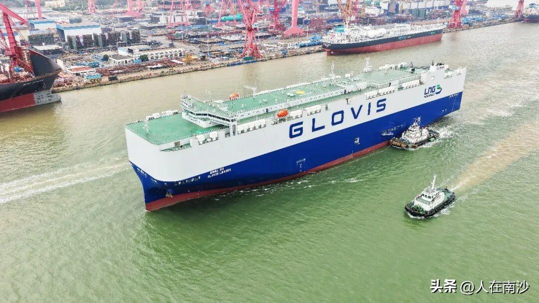 【全球首艘万车级汽车运输船南沙造!】3月31日,中船广船国际为韩国HMM公司建造的10800车LNG双燃料汽车运输船(PCTC)1号船出海试航,这是目前全球在建的首艘万车级双燃料汽车运输船。 根据介绍船体总长230米,型宽40米,结构吃水10.5米,航速约19节,在高效运输与稳定航行间实现完美平衡。其中14层车库甲板设计,可灵活装载电动汽车、氢能源汽车及重型卡车等多元车型,单船最大装车量达10800辆。按5米一台标准车,所装载的车首尾相连,超过50公里。 这艘船采用燃油和LNG双燃料推进系统,配置轴带发电机,可以一边航行一边完成发电,从而达到节能减排的目的。 汽车运输船是高技术、高附加值船型,其建造难度大、技术含量高。一是该船需大量采用薄板建造,广船国际建造团队成功攻克了薄板变形控制的难题;二是滚装设备多,机械化程度高,过去这些滚装设备大都依赖进口,现在全都实现了国产化。