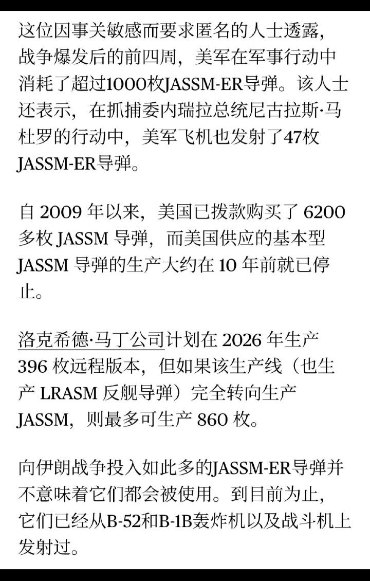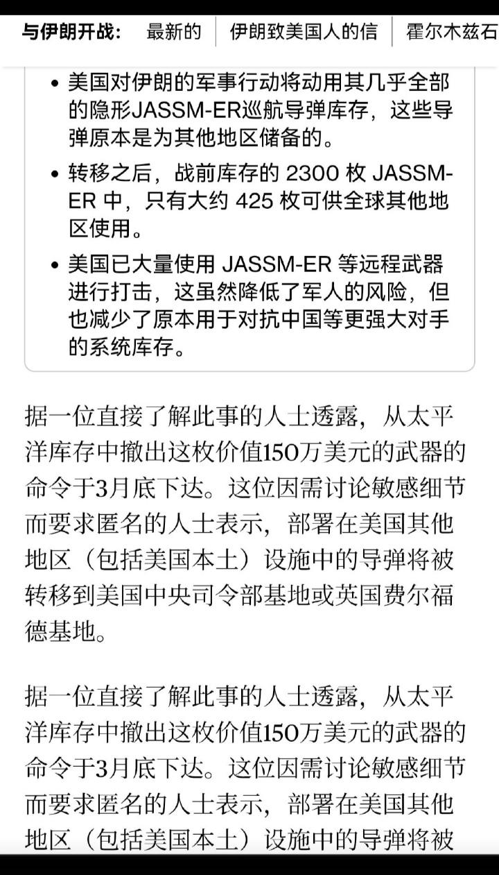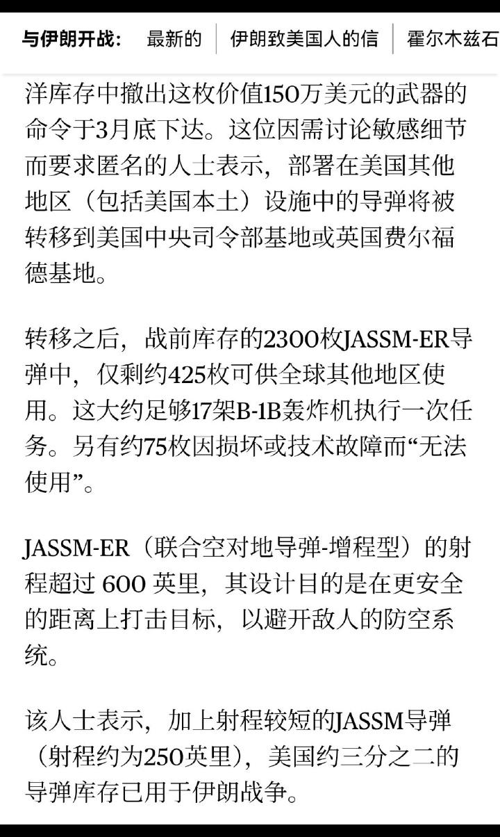 一仗把家底掏空,霉菌要在西太躺平了吗!?当年一帮殖人吹嘘霉菌齐射几千枚JASSM,一轮就能把兔子沿海目标团灭,那个兴奋啊,现在看来就是个笑话! 据彭博社报道,来自美军内部消息人士透露,美军在3月底已经下令将用于太平洋地区库存的大部分JASSM导弹悄悄转移到中东用于伊朗战争了。 这些拟用于太平洋地区的JASSM ER导弹库存量约2300余发(包括AGM-158A、AGM-158B),现今已有超过1800被调往中东,只剩下420多发可供全球其他地区备用了。 这样看来,美军这一仗就几乎把家底掏空了,这说明霉菌根本就不想在西太干架又或者是打算在西太彻底躺平了!