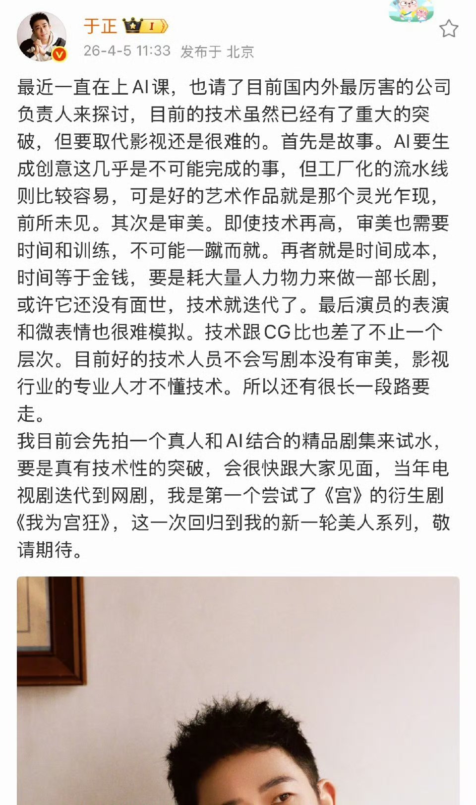 于正试水ai剧于正拍ai剧了影视创作解锁全新玩法!于正深耕创作之余钻研AI领域,