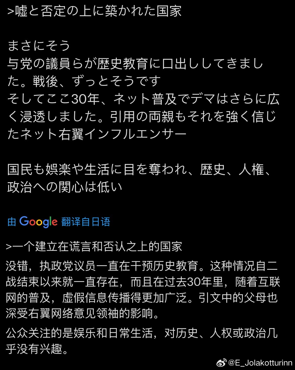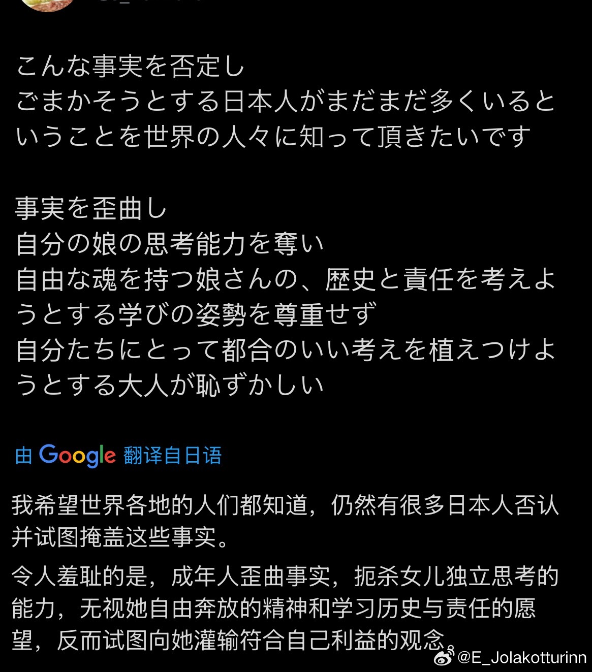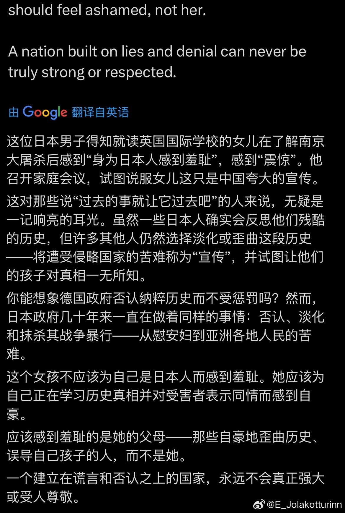 最近,图一这条日本右翼帖文在海外热传:一位日本父亲因女儿在国际学校学到南京大屠杀历史并为日本感到羞耻,他大为震惊,竟洗脑女儿否认这段历史。该帖被日本右翼追捧的同时,也遭全球网友痛批。