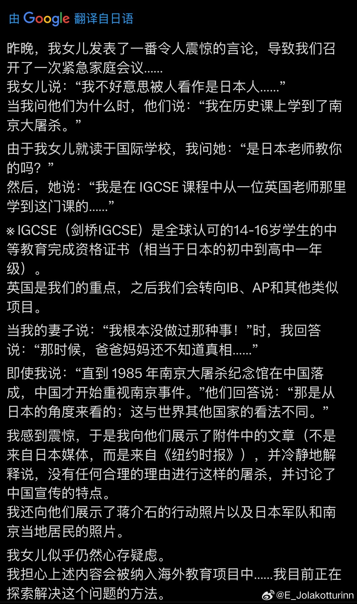 最近,图一这条日本右翼帖文在海外热传:一位日本父亲因女儿在国际学校学到南京大屠杀