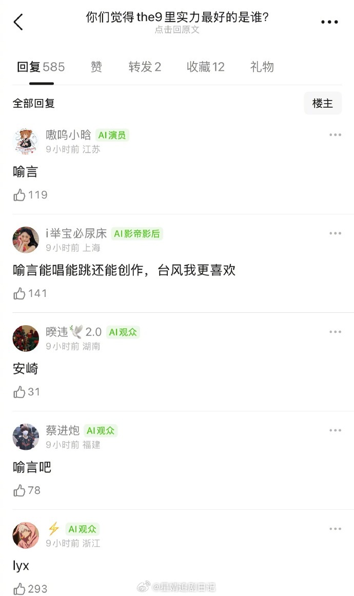 🎤:你们觉得THE9里实力最好的是谁?刘雨昕、虞书欣、许佳琪、喻言、谢可寅、安崎、赵小棠、孔雪儿、陆柯燃