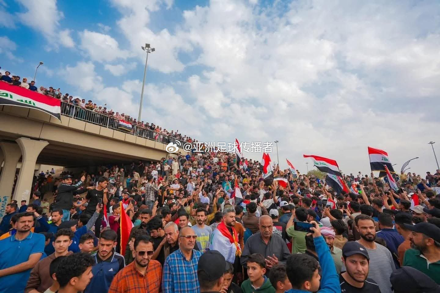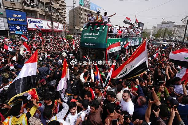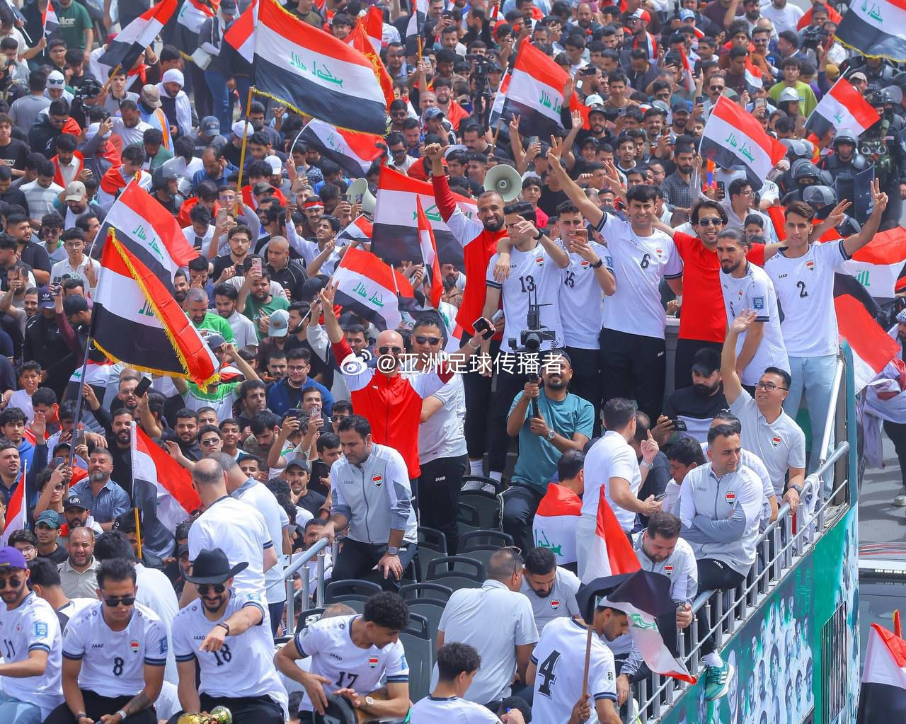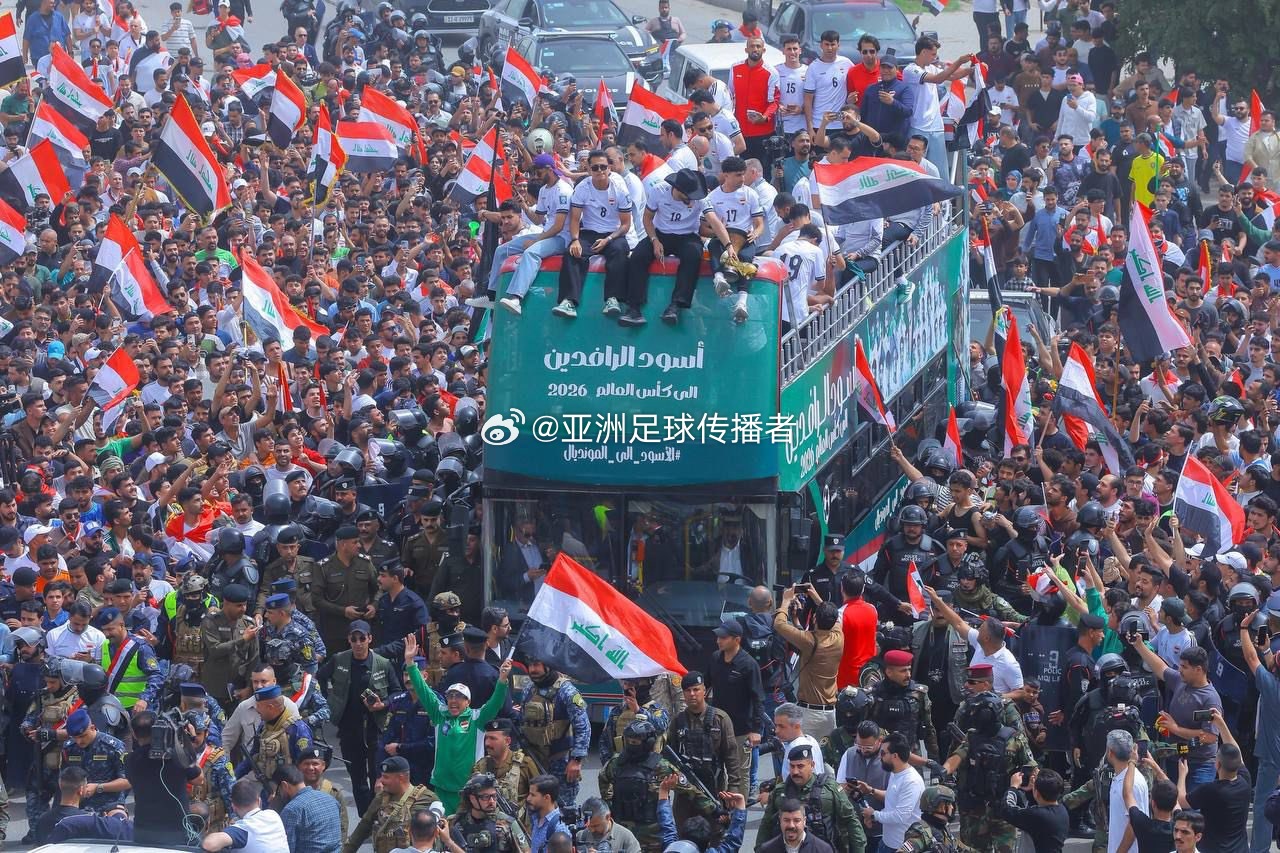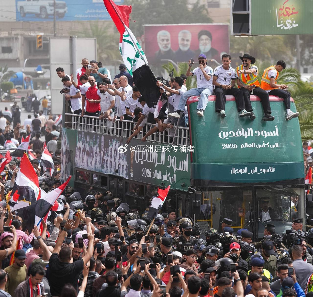 伊拉克国家队大巴在巴格达街头巡游,球迷们围拢过来欢呼庆祝