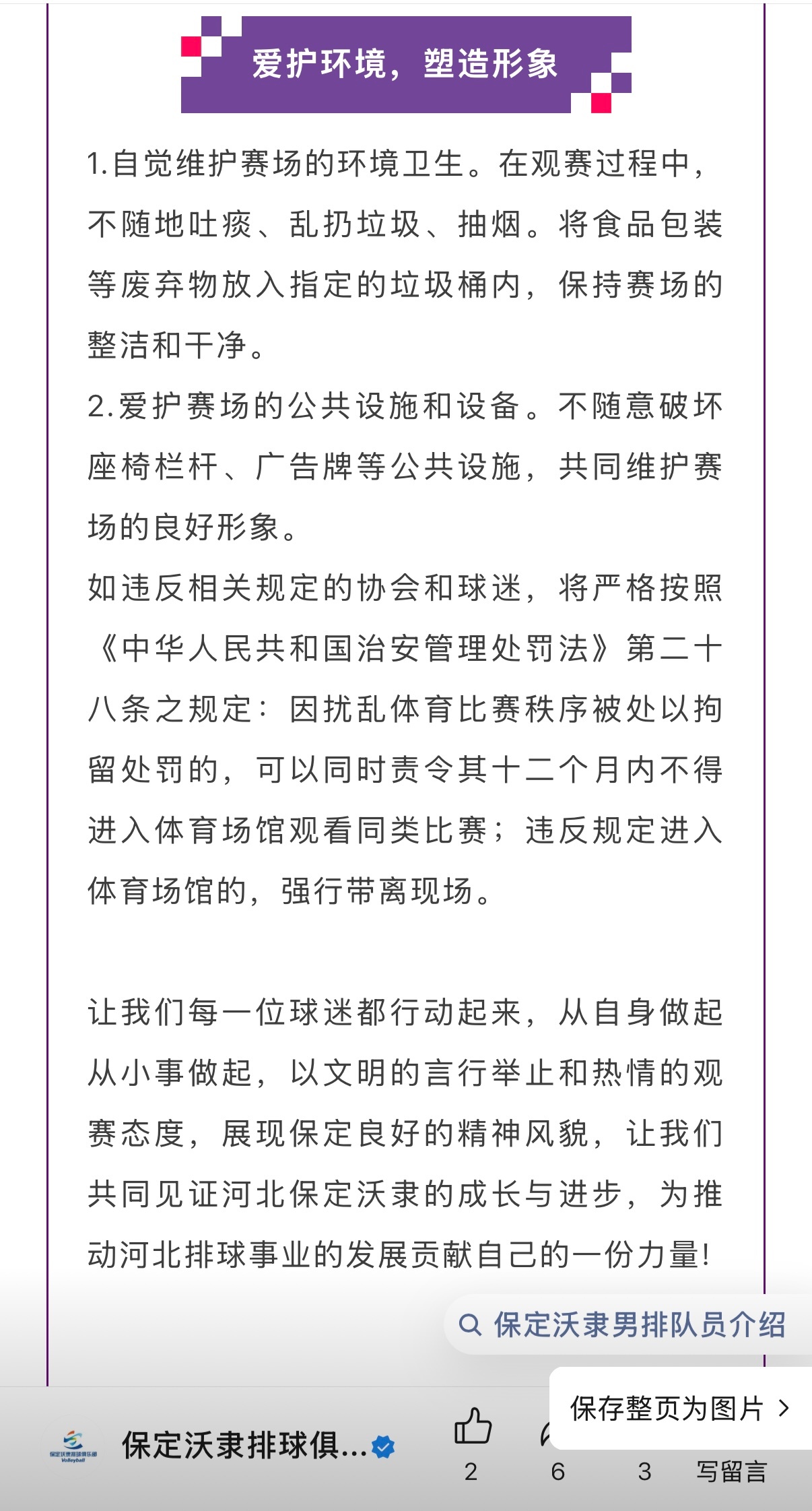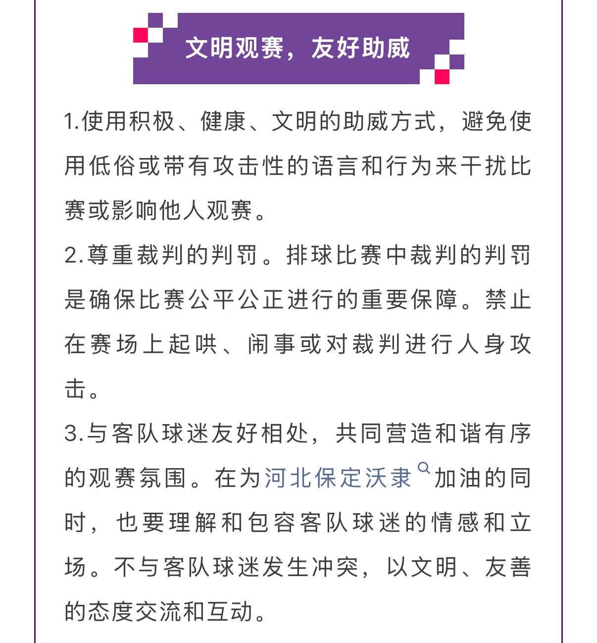 河北保定沃隶男排俱乐部发文【文明观赛倡议书】