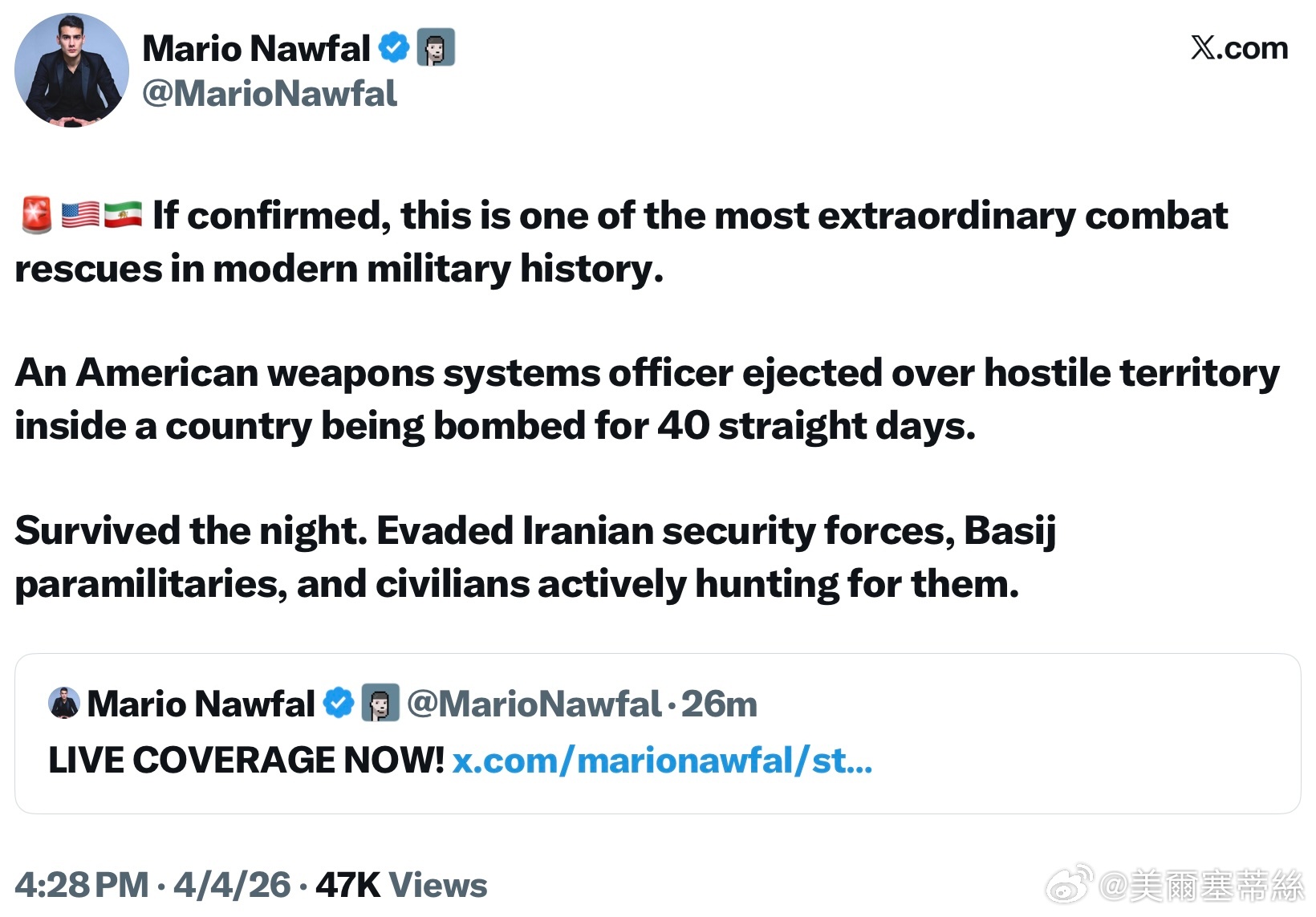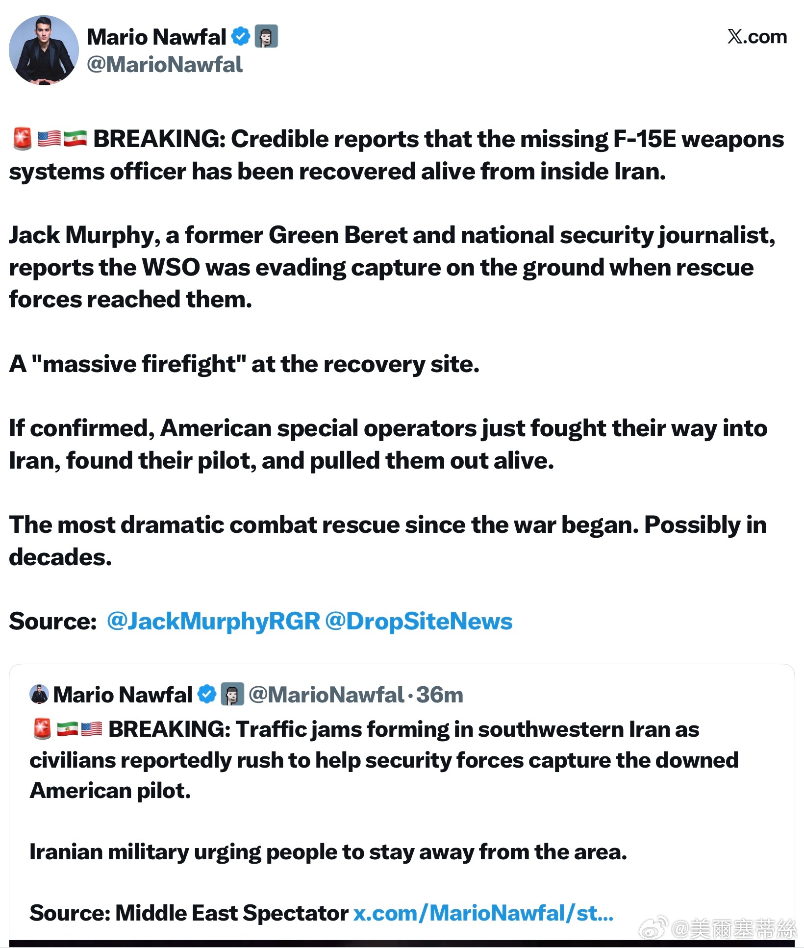 如果這一消息得到證實,那便意味著美國特種作戰部隊剛剛透過武力突入伊朗境內,成功尋獲了失蹤的飛行員,並將其活生生地救了出來。