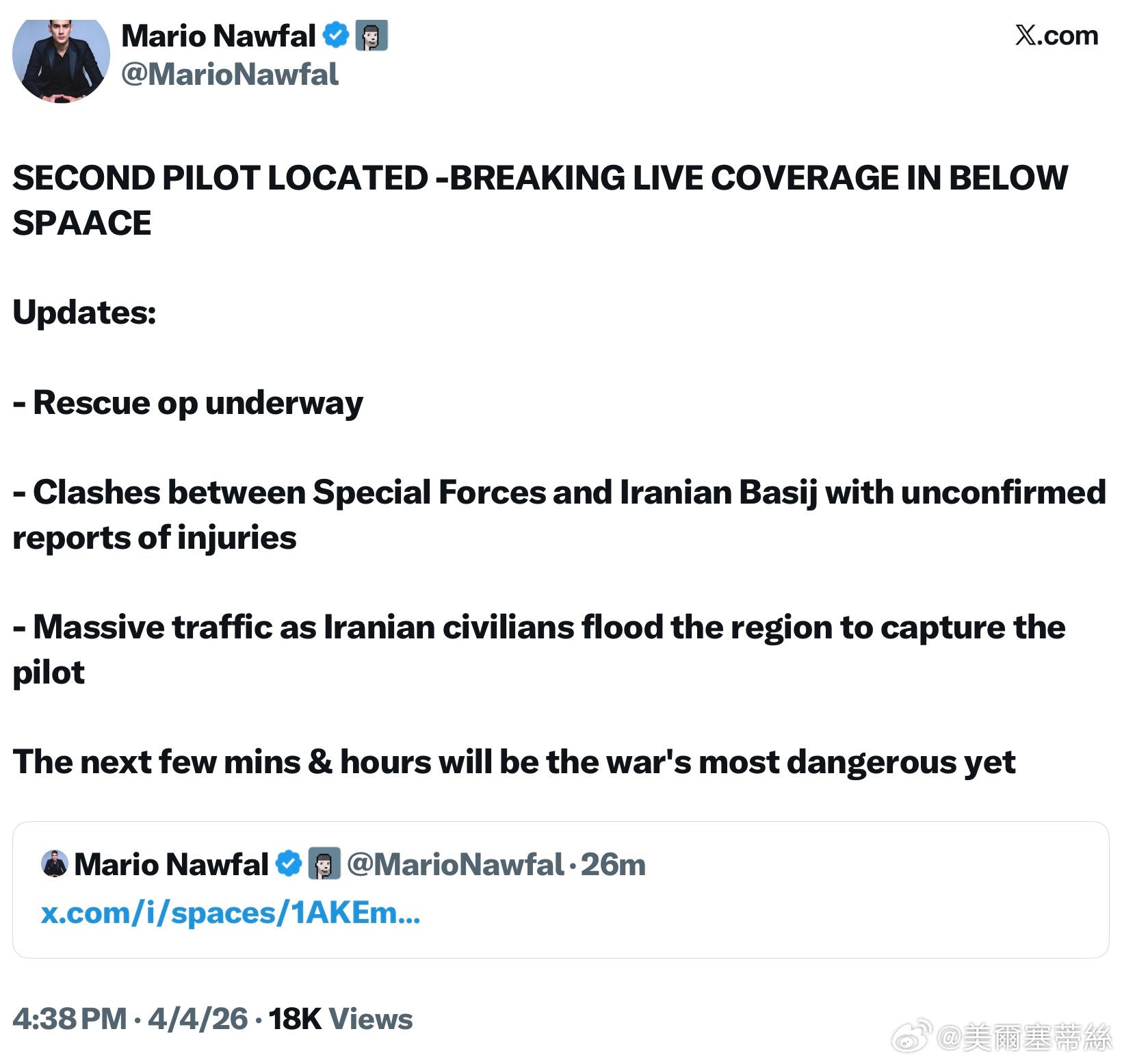 找到了!🔥 據可靠報告顯示,先前失蹤的F-15E戰鬥機武器系統官在伊朗境內已被成功找到,且仍然生還。🙏