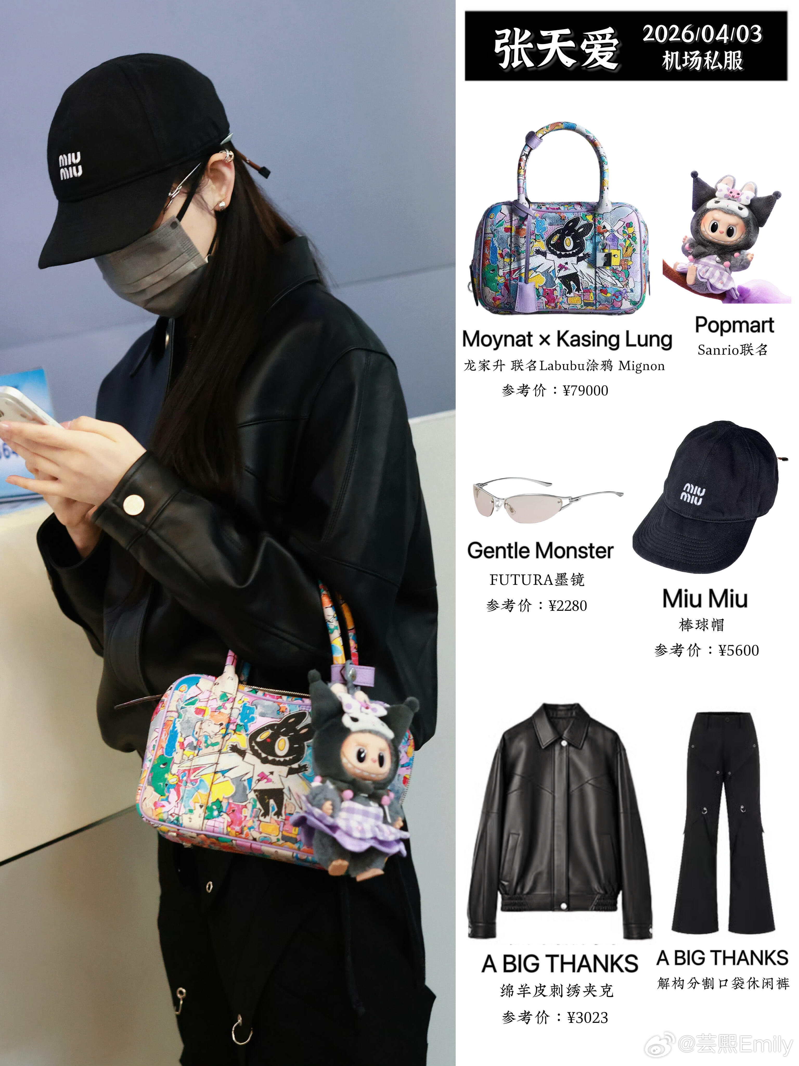 张天爱出发浪姐Labubu联名包搭Labubu挂件张天爱出发录制《乘风2026》的机场私服,皮衣棒球帽穿搭。包包是之前Moynat与艺术家、Labubu之父龙家升的联名合作款,量很少的,也很少见人背。张天爱还挂了Popmart和Sanrio联名的Labubu挂件,全是这个IP的联名了。