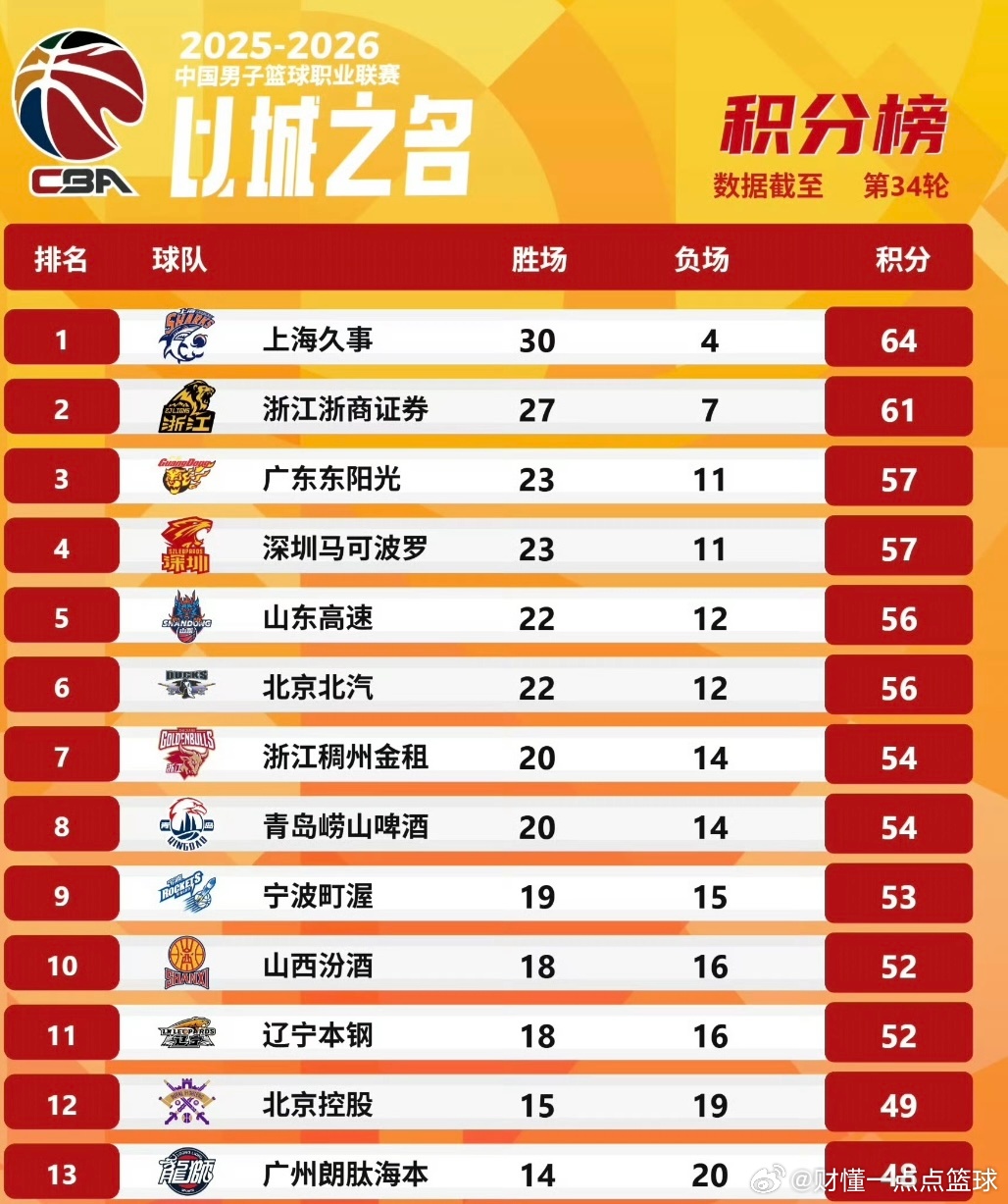 第34轮积分榜炸锅!广东宏远杀回前三,深圳9连杀稳坐第四,广州跌出前12!CBA第34轮打完,广东省三支球队排名如下:广东宏远男篮硬刚广厦,拿下关键胜利,直接杀回第三;深圳男篮更狠,史密斯读秒反绝杀北控,豪取9连胜,死死咬住广东,稳居第四;而广州男篮本轮输球,直接掉到第13位,季后赛席位悬了!本轮过后,广东宏远男篮和深圳男篮已经提前锁定季后赛席位了!山东男篮昨晚30分输给了宁波男篮,这个比较意外,所以广东和深圳有望以三、四名直接晋级季后赛,不用打附加赛,加油哦!广东男篮vs广厦男篮广东宏远广东宏远