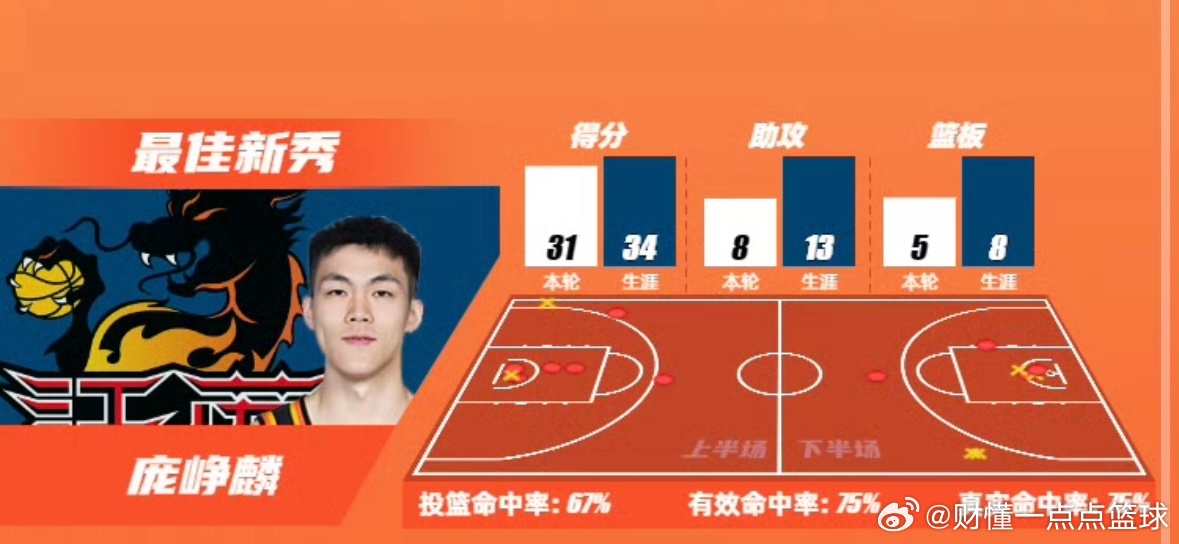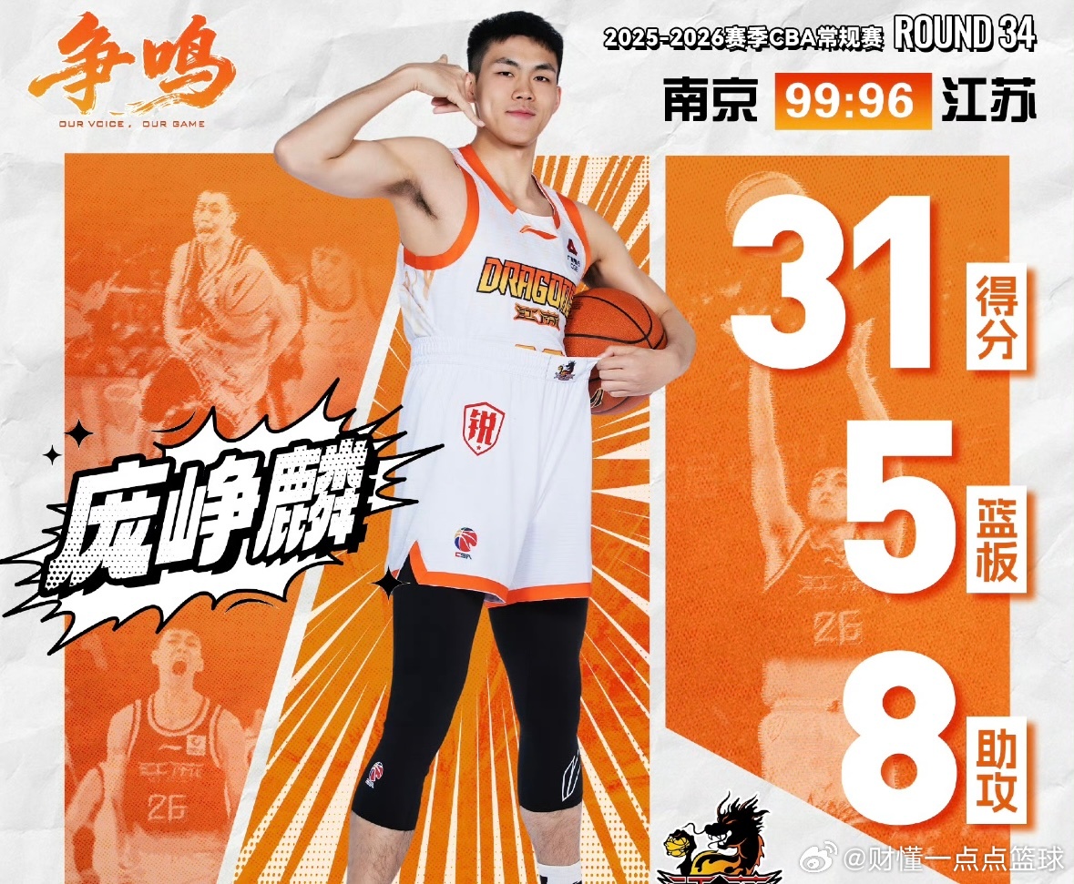 广西“超跑”再封神!庞峥麟31+8+5爆砍生涯级数据CBA第34轮,江苏肯帝亚对阵南京同曦,“广西超跑”庞峥麟彻底打疯了!全场狂轰31分8助攻5篮板,投篮命中率高达67%,有效命中率、真实命中率双双75%,攻防两端完全统治赛场,毫无悬念拿下本轮最佳新秀!这场球庞峥麟拼尽了全力,得分、组织一肩挑,三分、突破、串联样样在线,把同曦防线冲得七零八落,硬生生把球队扛在肩上。可无奈队友集体拉胯,进攻端毫无建树,防守端漏洞百出,硬生生把一场该赢的球打没,让庞峥麟的生涯级表现彻底沦为空砍。本赛季庞峥麟持续爆发,进步肉眼可见,早已是江苏绝对核心。只可惜球队整体实力拉胯,空有顶级个人表现,却难换一场胜利,实在让球迷意难平!庞峥麟
