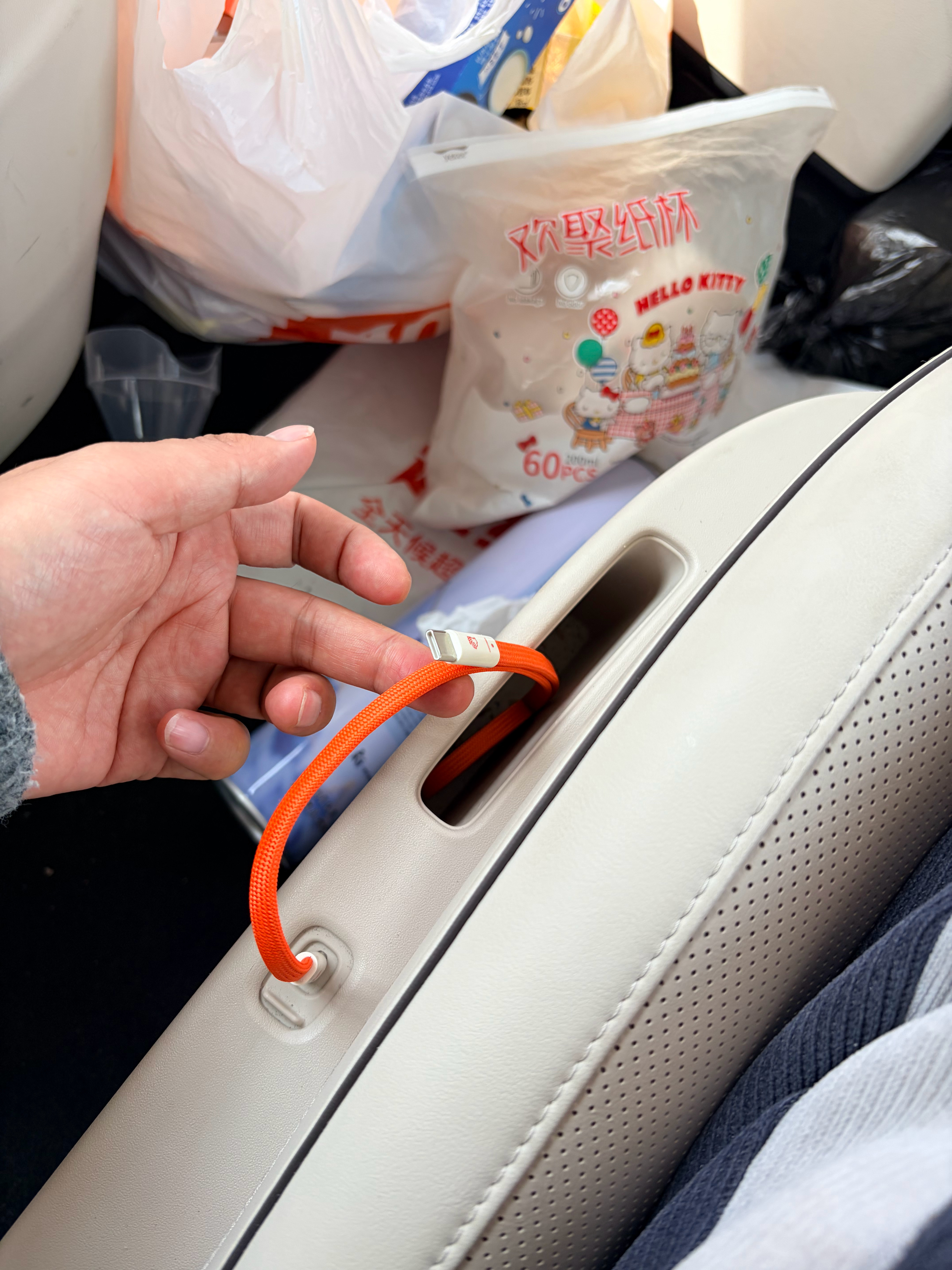 理想这个二排充电口很适合插一个贴贴线,不用的时候卷起来放旁边插槽,但之前买的一直都是插进去扭 90 度才能放收纳槽,刚发现好像怒喵这个线是最完美的,等这根坏了我换成怒喵的(毕竟上周刚坏了 JD 换新了)。