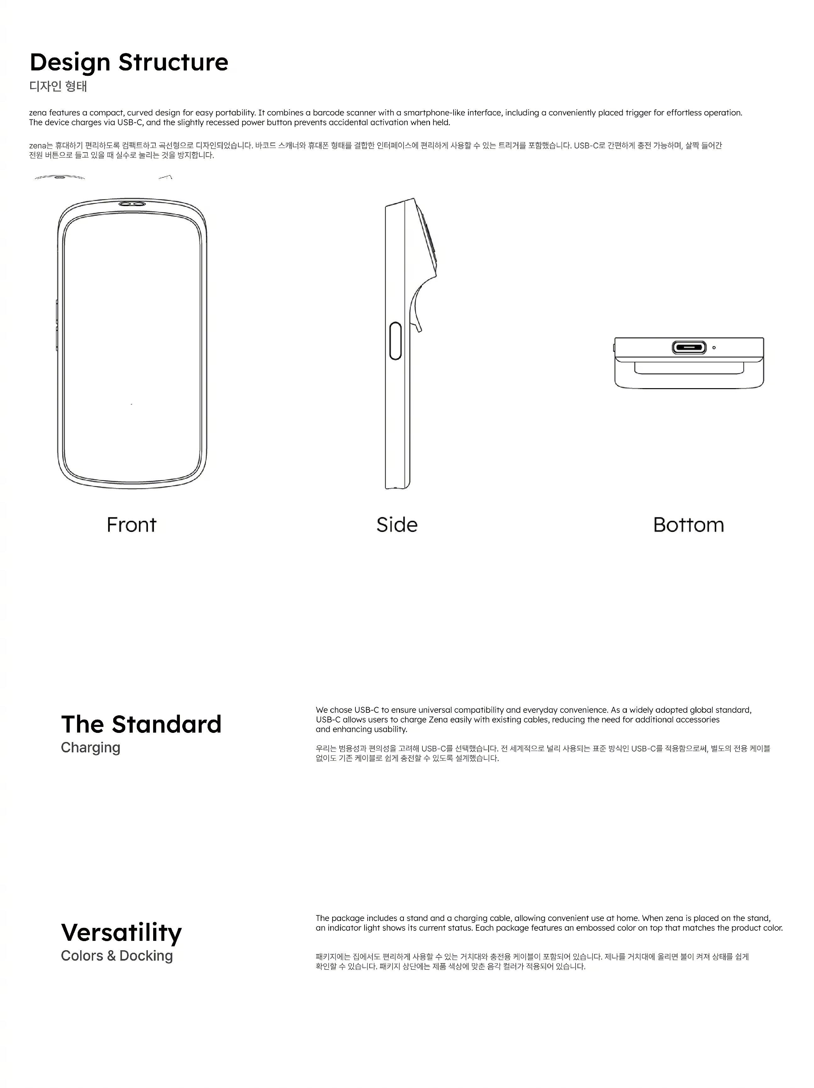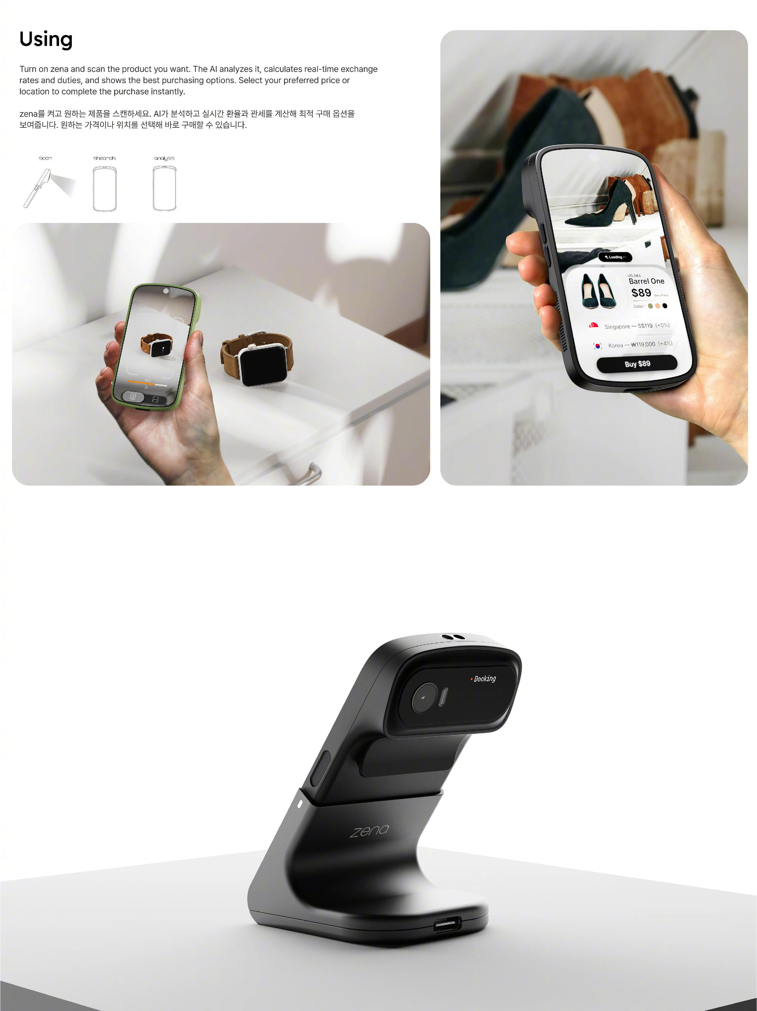Zena人工智能购物设备zena是一种人工智能智能购物设备,可以实时分析产品,并计算汇率、关税、税金等总成本,帮助用户做出明智的购买决定。人工智能集成产品zena,它可以实时可视化本地化关税和税收,将成本透明度转化为有形的用户体验。Zena的特点是紧凑,弯曲的设计,便于携带。它结合了一个条形码扫描器和一个类似智能手机的界面,包括一个方便放置的触发器,可以轻松操作。该设备通过USB-C充电,稍微凹陷的电源按钮可以防止手持时意外激活。设计师:TAEHYEONG KIMYU JEONG CHOI