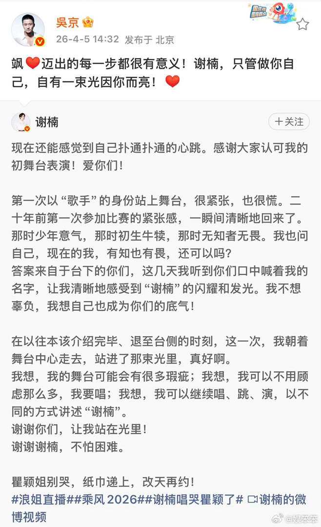 吴京回应谢楠初舞台吴京夸谢楠飒 楠京这糖太甜了!吴京转发表白让她只管做自己,还说有光因她而亮,在线打call的样子太暖了