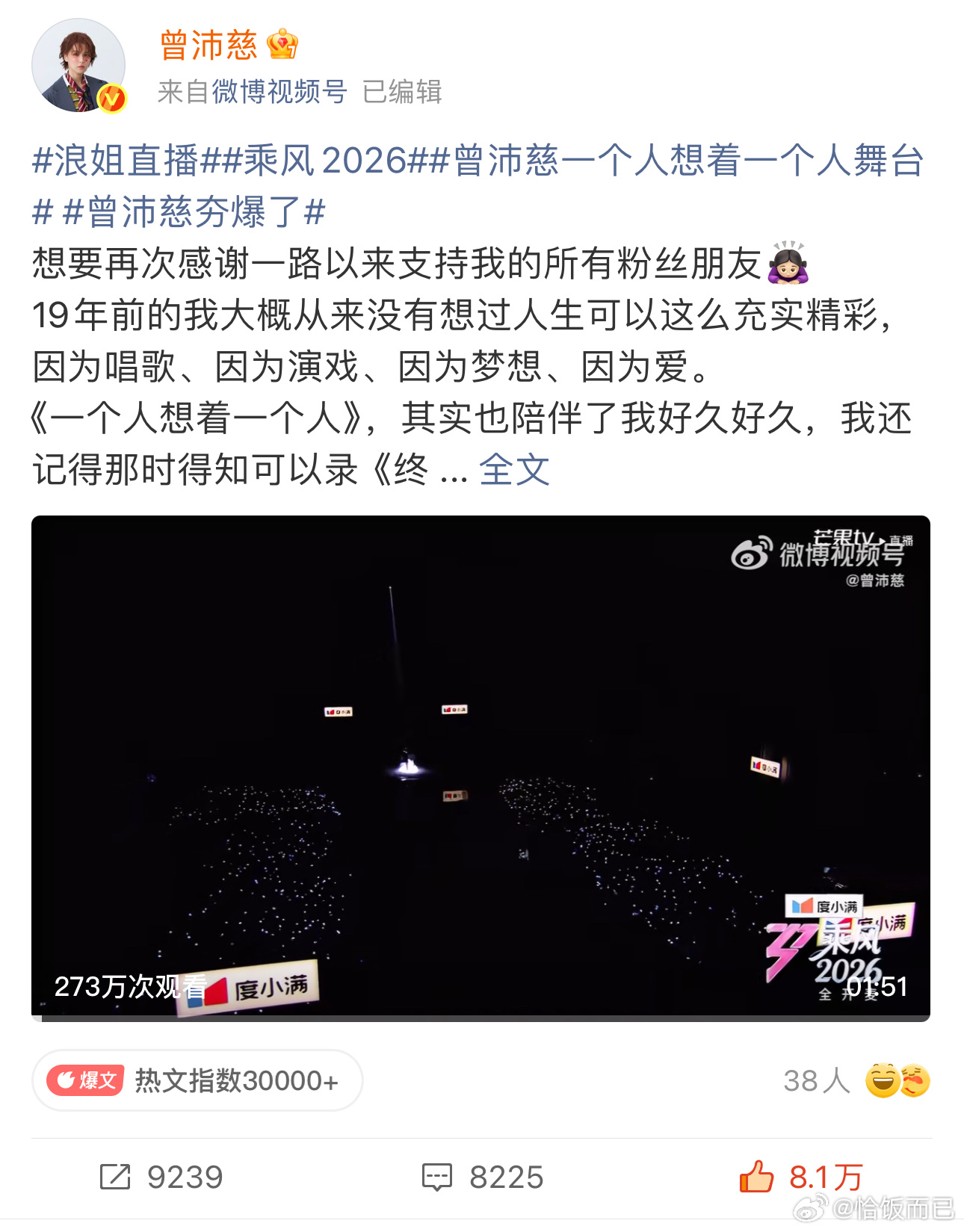 曾沛慈乘风2026初舞台不到24h破百万点赞,官抖唯一破百万赞视频💅b站热门播放量已破79.6万,🧣播放量273万,🍠舞台视频点赞👍已破9.6万! 曾沛慈热度