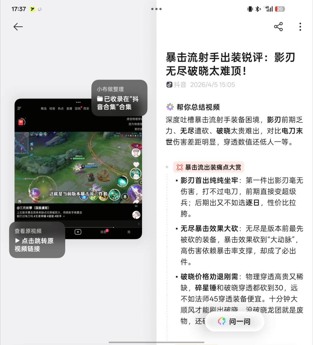 短视频直接扔给小布,他帮你总结,甚至你还可以跟他继续对话。