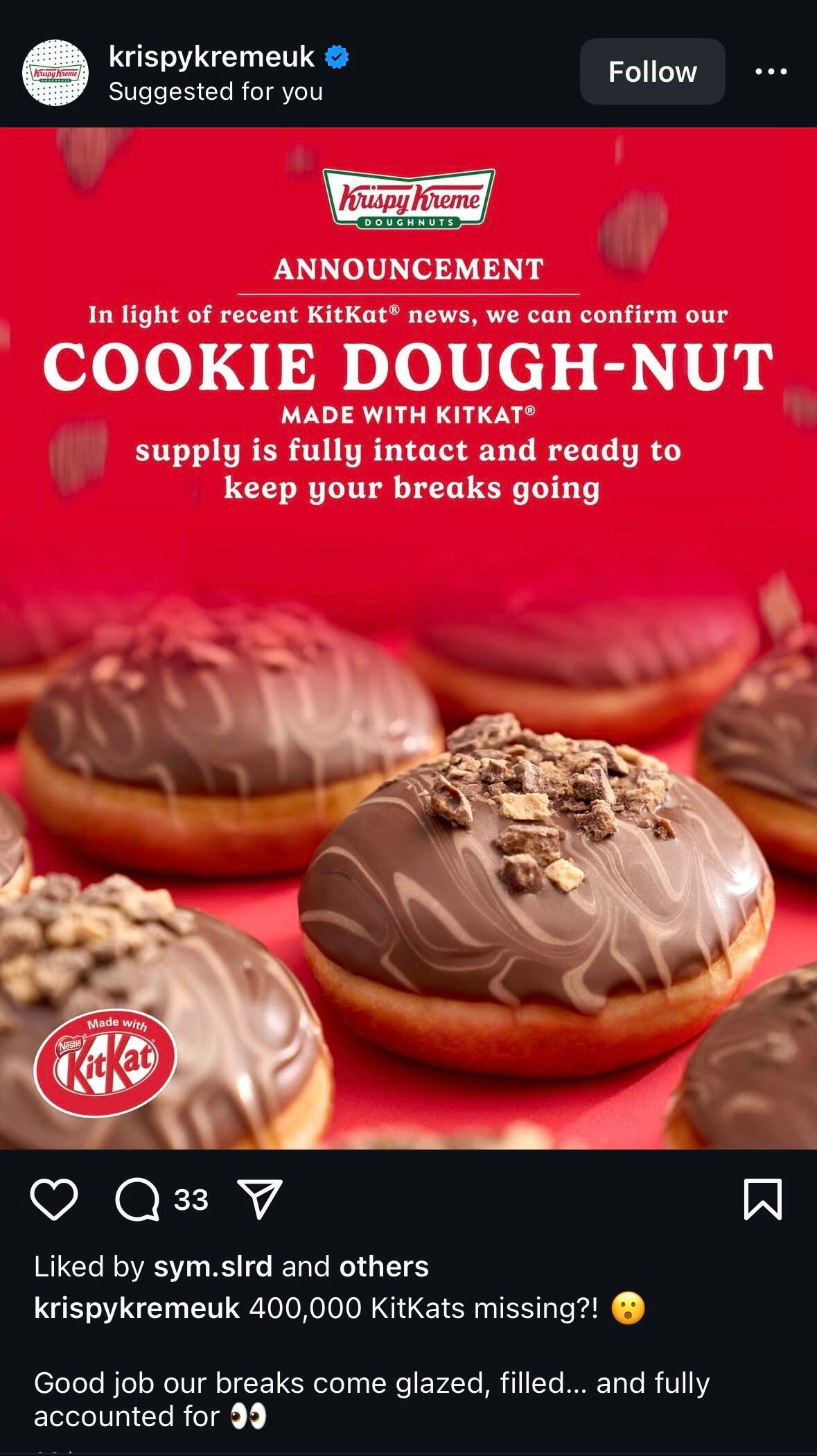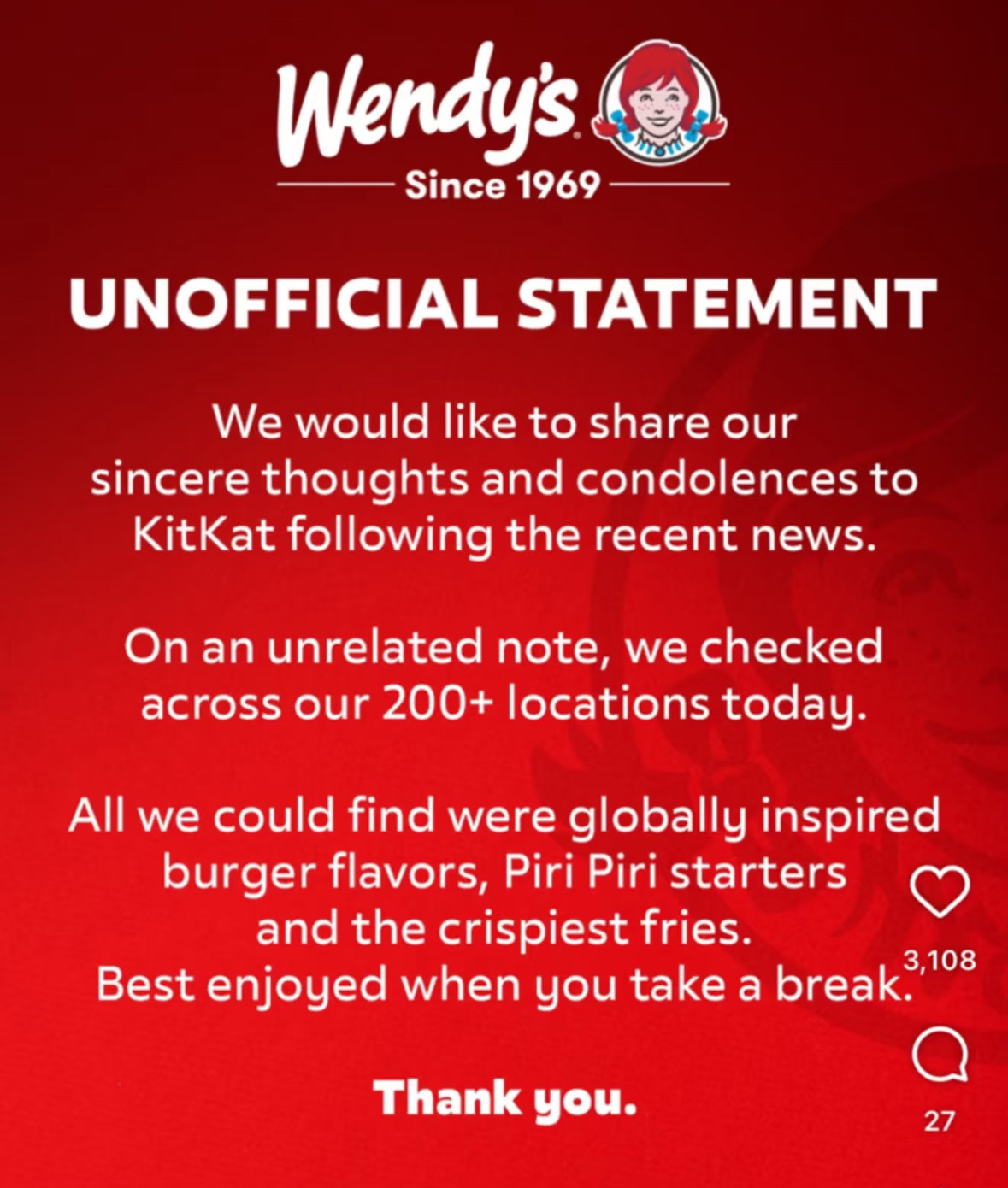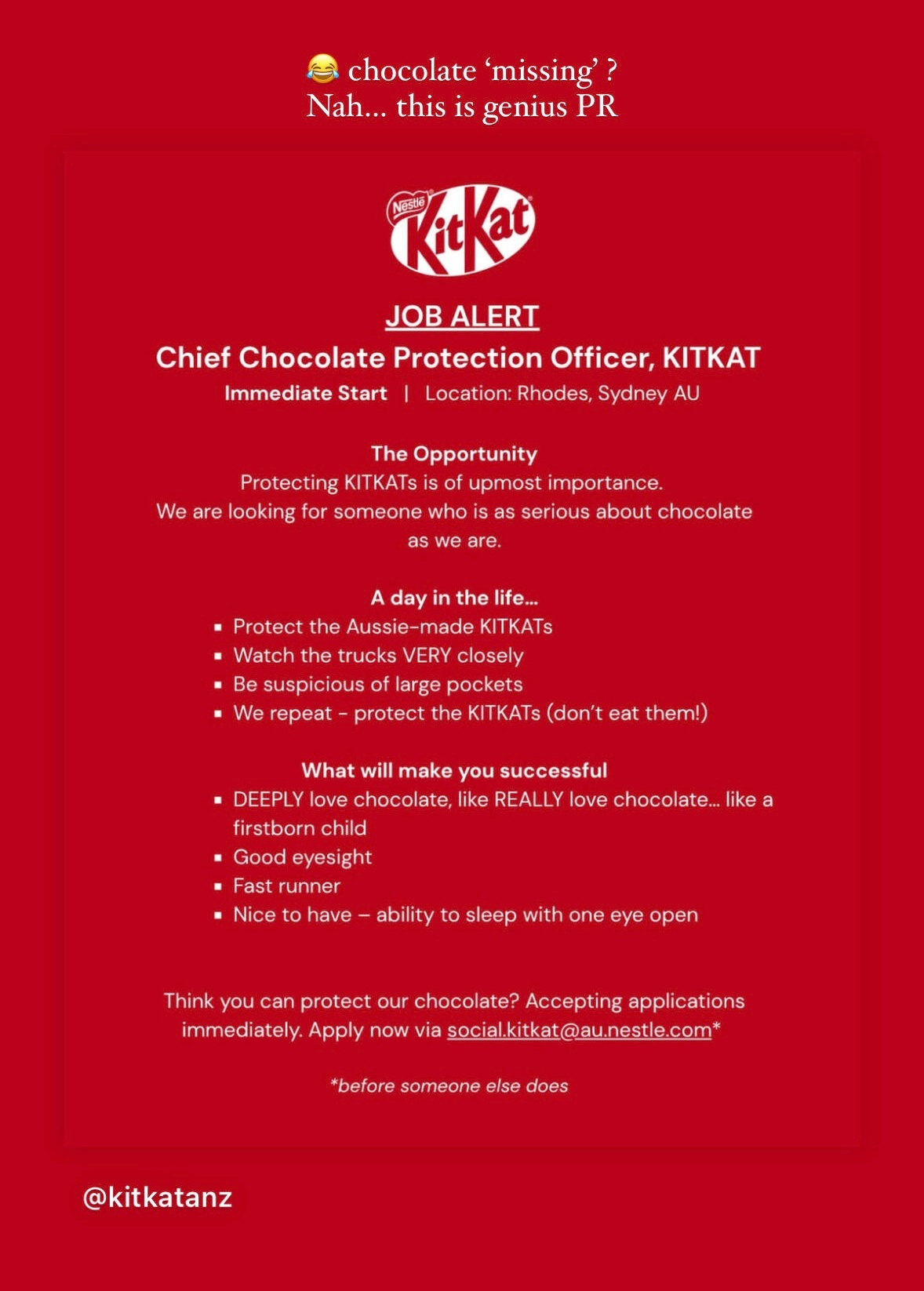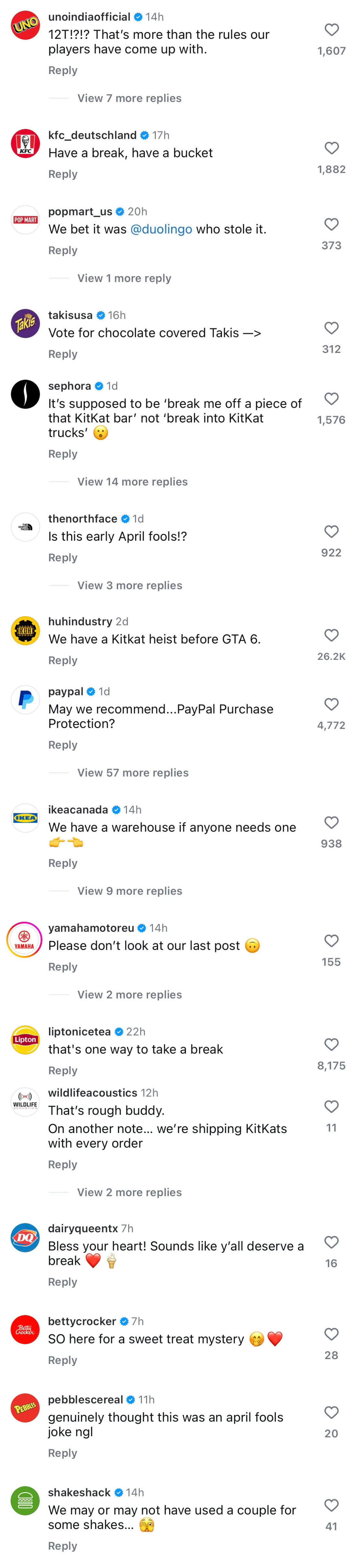 雀巢12吨KitKat巧克力被盗,除了雀巢夸奖盗贼有卓越的品味,还有后续Ikea:如果有人需要仓库,我们这里有一个popmart:我们敢打赌是duolingo 偷的duolingo (多邻国): 我看不懂波兰语的营养成分表。petsmart :听说有这么多只猫(kats)失踪了,我们深感忧虑……KitKat回应12吨巧克力被盗