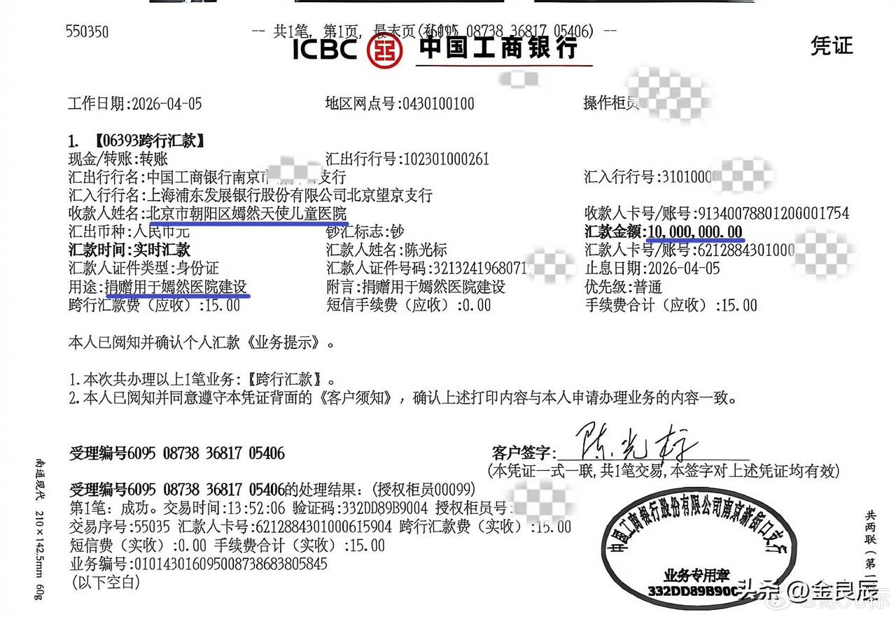 不可思议,“标哥”晒出给嫣然天使医院的1000万元捐款凭证,我却发现了一个惊人细节! 4月5日下午16点13分,中国慈善家陈光标在其微博账号发文,回应给张雪赠送价值1300多万元的劳斯莱斯豪车后续结果。据陈光标在视频里的说法,鉴于张雪几天来没有提车,而且公开表示要将车让二手车商回收变现并转捐嫣然医院,于是他尊重张雪意愿,已在今天将车款转给北京嫣然医院,还会一直支持李亚鹏的慈善事业。 “标哥”在网上晒出的转款凭证是中国工商银行南京新街口支行盖章出具的,显示是柜台办理,日期是2026年4月5日。凭证显示的收款人是北京市朝阳区嫣然天使儿童医院,捐款用途是“用于嫣然医院建设”。而这一笔金额高达1000万元的捐款,工商银行南京新街口支行只收取了15元的手续费! 我不懂银行系统对捐赠类资金往来的收费标准规定,但我记得我在2008年给亲戚在柜台办过一次转账汇款,金额是1500元,手续费收了15元,也就是千分之一。如今都2026年了,工商银行的转账汇款手续费是多少我不知道,但这一笔1000万元的捐款只收了15元手续费,到底是不是真的?银行有这么慷慨大方吗?欢迎懂行的网友说说。