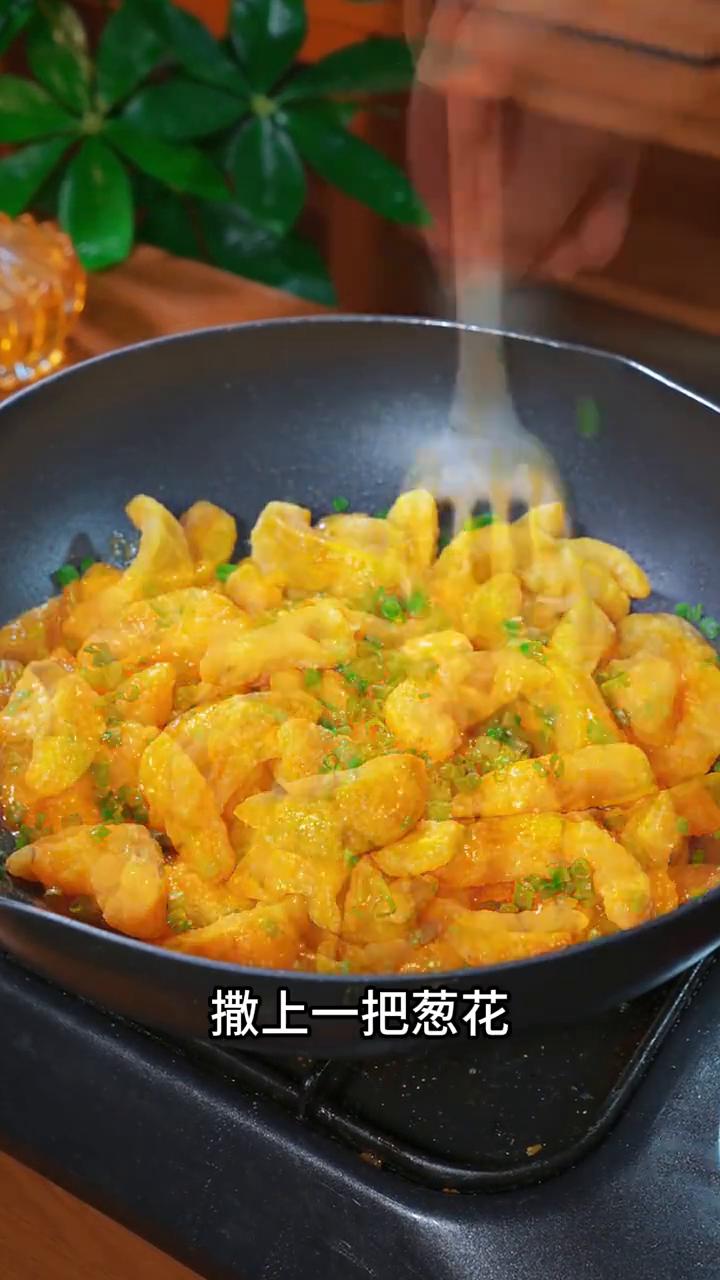 咸蛋黄贝贝南瓜。 家人们注意看,这是最近网上很火的贝贝南瓜神仙吃法,餐厅一份要卖98,自己在家做成本还不到3块,外酥里糯,我家5个儿子每次都能吃光盘,做法跟喝凉水一样简单,5秒钟教会你。 ·地里捡来的南瓜改刀切成条,一定要用开水焯烫30秒,这样能让南瓜更好的裹上一层淀粉。 ·接着碗里打入两个笨鸡蛋,6成油温下锅炸,等到表皮炸至定型后用漏勺轻轻翻动,一直炸至金黄酥脆时捞出。 ·另起锅倒少许油,好吃的关键就是这个大家都说好吃的海鸭咸蛋黄酱,只需要两勺,开小火炒至流沙冒泡泡,再倒入炸好的南瓜,撒上一把葱花,快速的翻炒均匀即可出锅。 咸香的蛋黄酱包裹着酥脆的南瓜,真的特别好吃,一上桌孩子们都抢着吃。 想试试不知道这个海鸭咸蛋黄酱哪里有卖的朋友,可以点我头像。