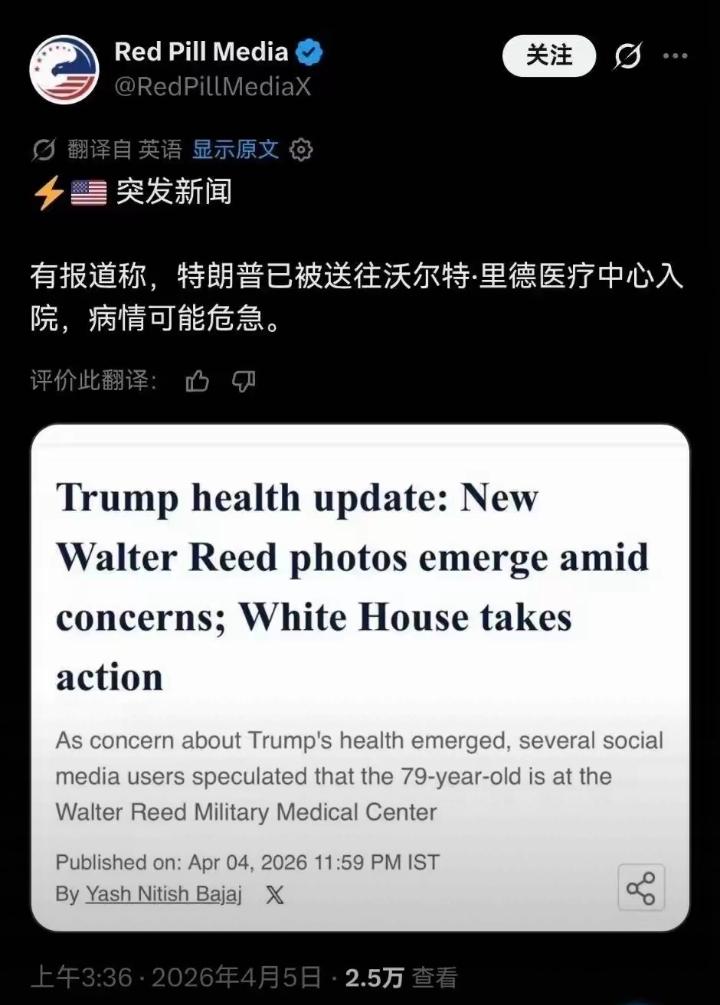 特朗普72小时未露面,越来越多传闻说他健康方面出问题了,但是否真出现问题,明天下午见分晓。 据常年在白宫采访的凤凰卫视记者王冰汝今日发文称:“特朗普将于周一下午1点在椭圆形办公室与军方举行新闻发布会。” 王记者常年在白宫采访,她的消息来源比其他所谓的前议员等人发布在社媒上的消息要可靠,就看明天下午特朗普会不会露面出席记者会了。 如果明天下午特朗普没有如期出现在记者会上,那么健康状况可能就是真出现问题了!