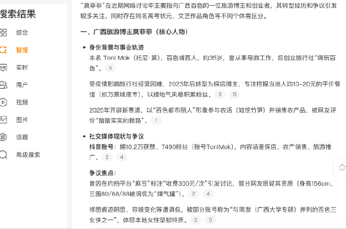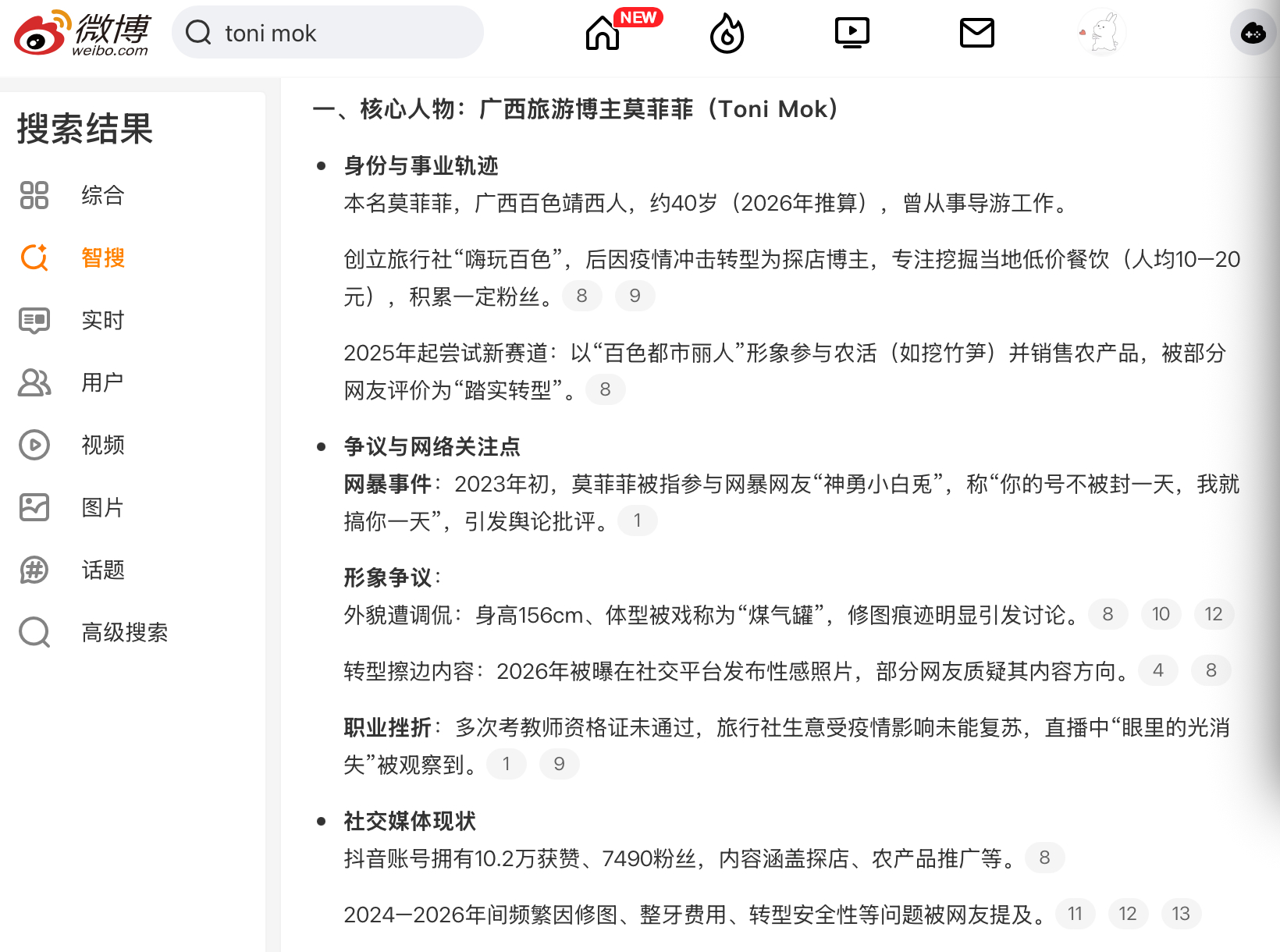 用嗨玩百色的莫菲菲Toni Mok曾经在2022年发表重要讲话,号召广西老乡网暴可爱又可怜的兔兔,时至今日,她已经退出微博,并且因为曾经下海被发现而改头换面,彻底放弃了“嗨玩百色”这个她倾尽半生心血做的品牌,停止探那些快餐店,转型为擦边博主。