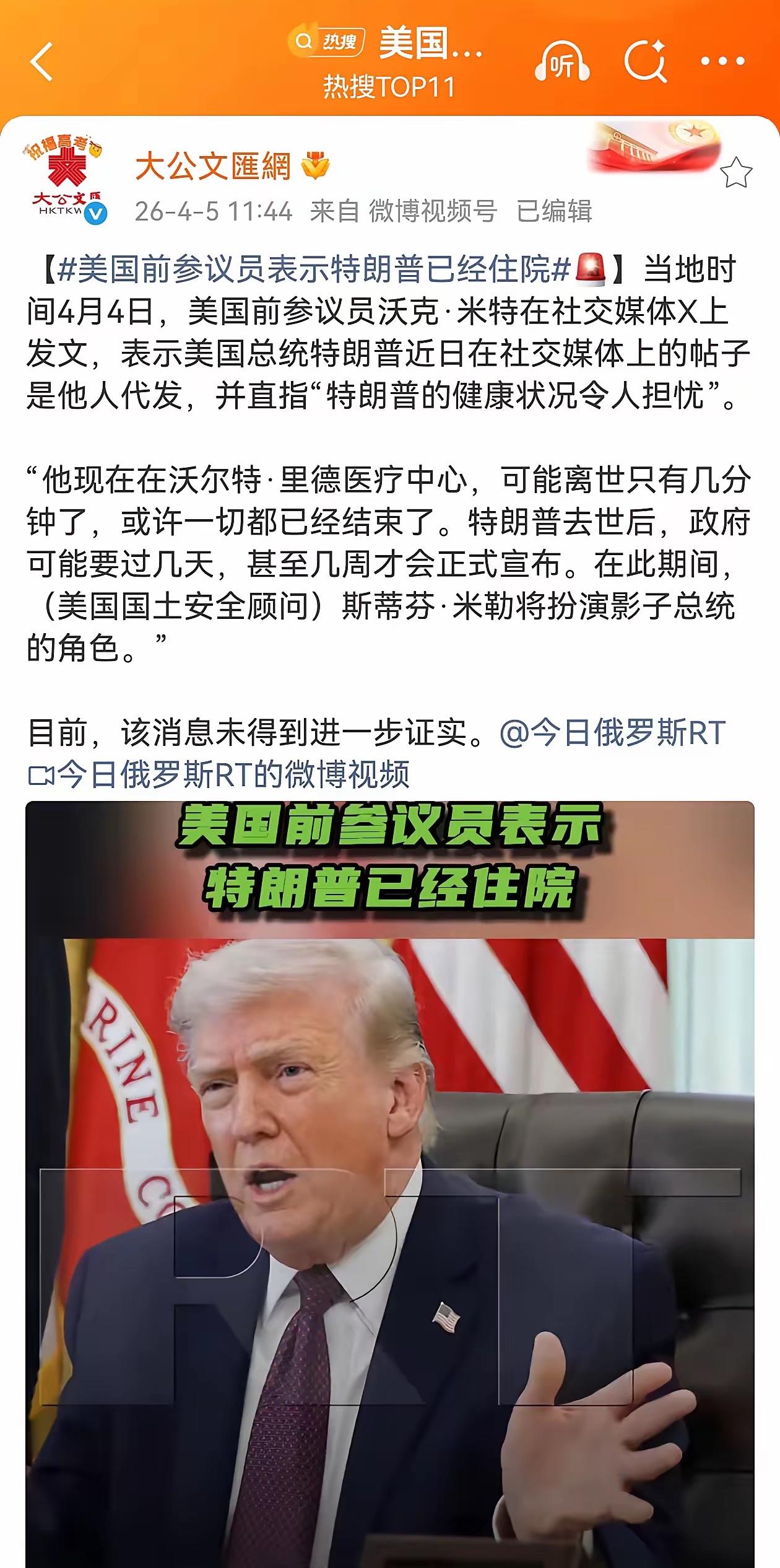 全网炸锅!特朗普突发健康传闻,白宫火速辟谣,背后政坛大戏比剧本还刺激 外网疯传特朗普现身沃尔特·里德医疗中心,甚至传出病危消息,白宫第一时间出面否认,明眼人都能看出,这波舆论风波绝非偶然。 前线战局不顺,特朗普直接临阵换将解雇陆军参谋长,对方不满发声,政坛火药味拉满。 更离谱的是,他还把司法部长帕姆撤职,导火索竟是爱泼斯坦档案公开惹出麻烦,连这场战事都被网友调侃成爱波斯坦联盟复活赛,局面彻底乱套。 政坛翻云覆雨全凭个人情绪,任性换人只会让局势更失控,所谓的健康传闻更像是政坛动荡的缩影。 你觉得这波风波背后藏着多少内幕?