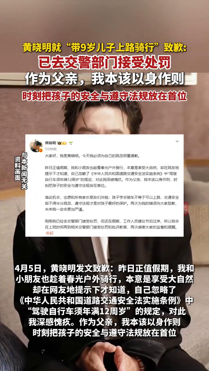 黄晓明就"带9岁儿子上路骑行"致歉:已去交警部门接受处罚。 作为父亲,我本该以身作则,时刻把孩子的安全与遵守法规放在首位。 4月4日,黄晓明布照片,照片中黄晓明带9岁儿子上路骑行,引发关注。 4月5日,黄晓明发文致歉:昨日正值假期,我和小朋友也趁着春光户外骑行,本意是享受大自然,却在网友地提示下才知道,自己忽略了《中华人民共和国道路交通安全法实施条例》中"驾驶自行车须年满12周岁"的规定,对此我深感愧疚。作为父亲,我本该以身作则,借此机会,也想和所有家长朋友们共勉:孩子学会骑车不等于可以上路,交通安全容不得半分疏忽,遵守法规才是对孩子最好的保护。再次为我的错误向大家致歉。
