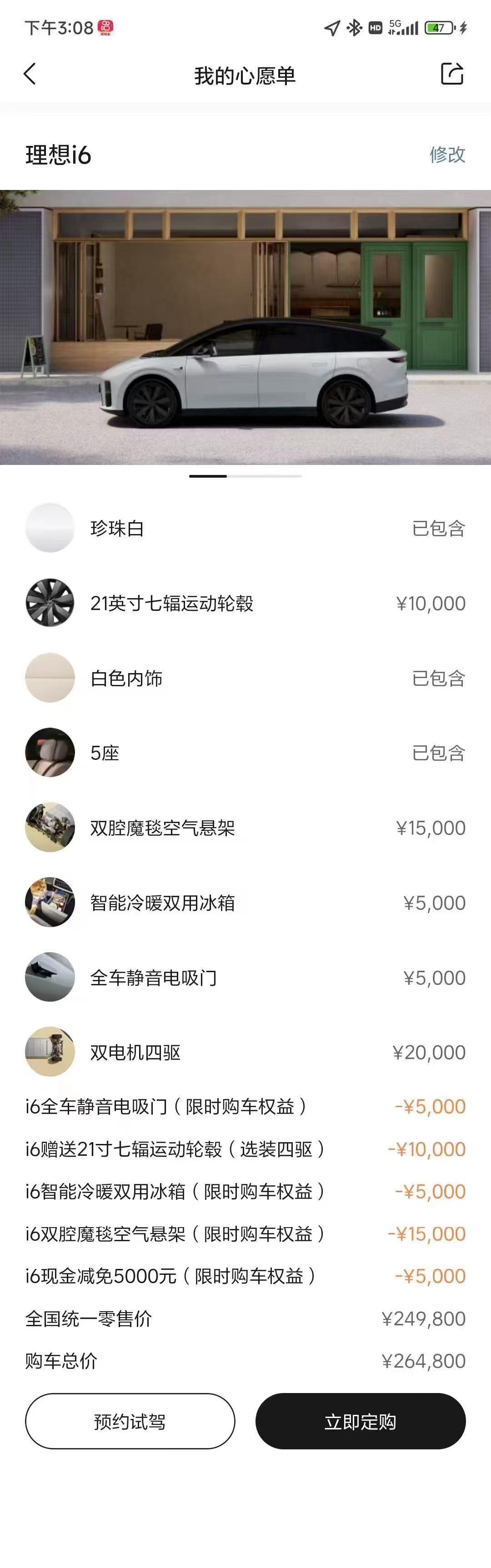 品牌:理想i6 车型:2026款标准版 排量:电动四驱 指导价:249800+5