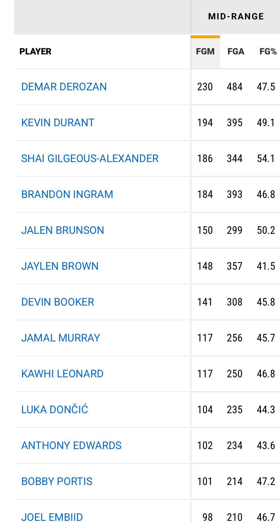 中距离产量前三为:德罗赞230,杜兰特194,亚历山大186