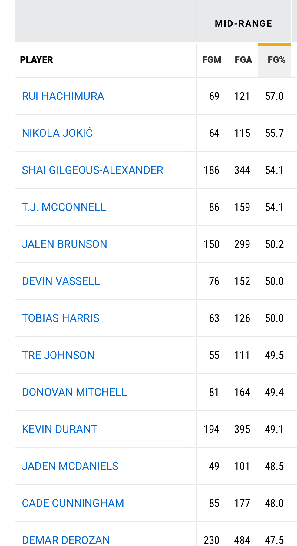 本赛季联盟中距离命中率第一为八村塁,57%(至少100出手)中距离产量前三为:德