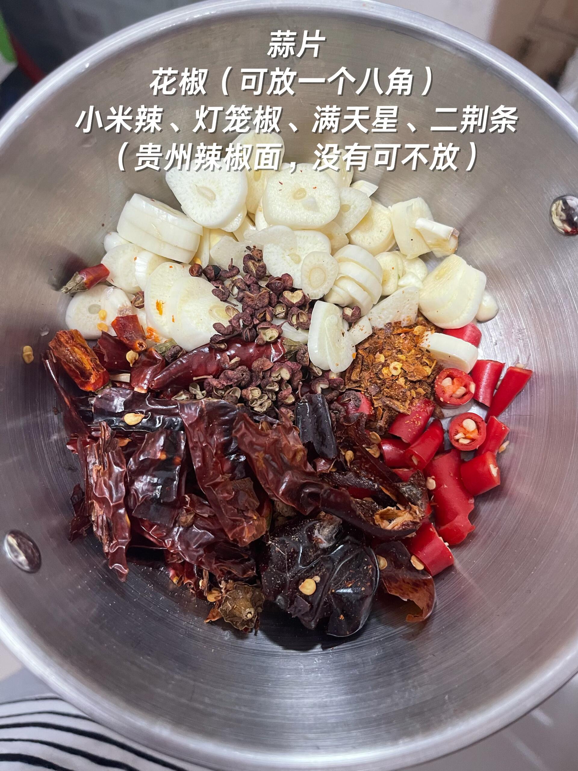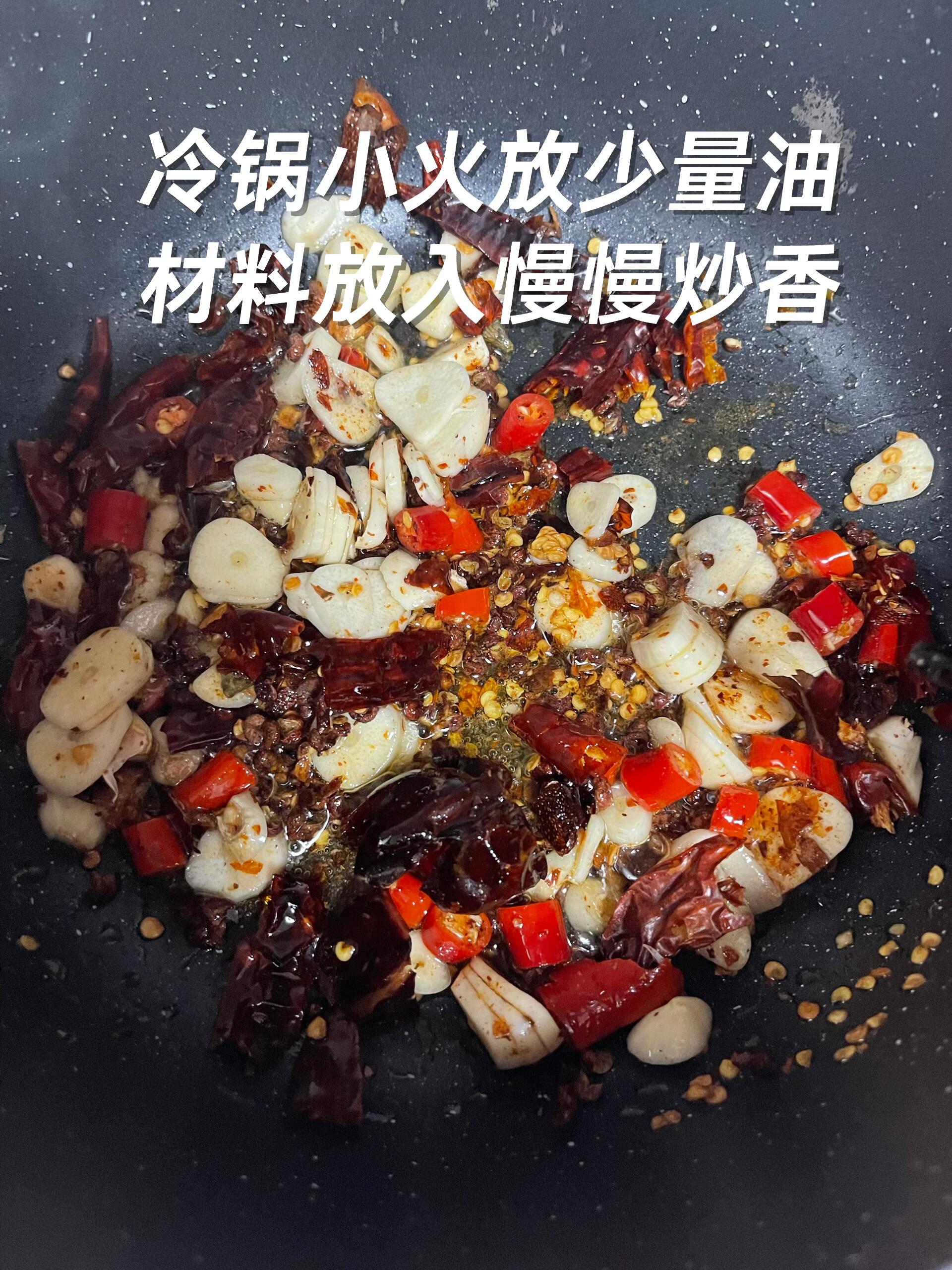 2️⃣ 冷锅冷油(油少量即可),小火放入蒜片、各种辣椒和花椒,慢慢炒出香味。