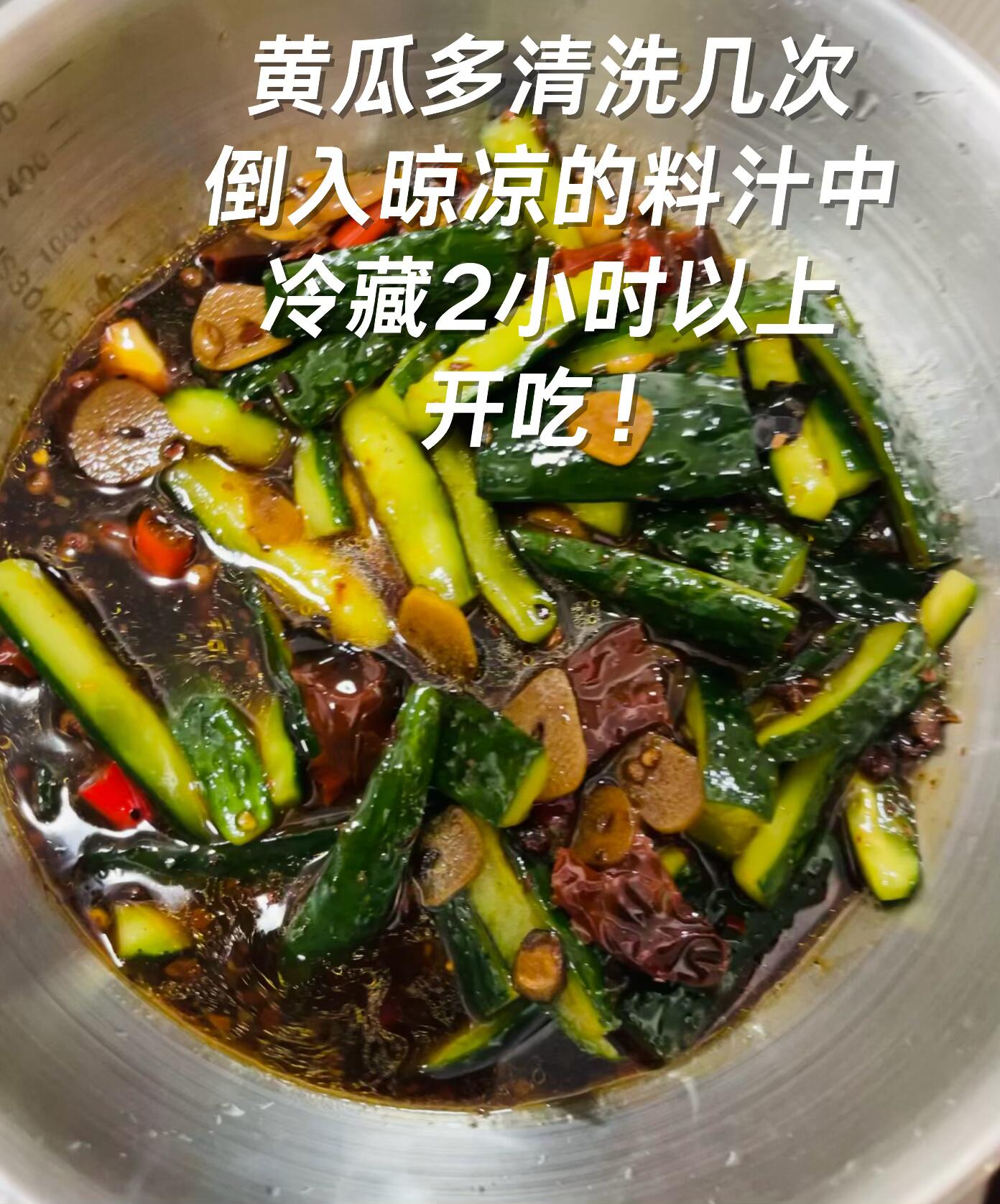 4️⃣ 将晾凉的料汁倒入黄瓜中,拌匀后放入冰箱冷藏腌制2小时以上,时间越久越入味! 这样做的泡黄瓜,脆爽入味,酸甜适中,不管是当开胃小菜还是小零食,都超合适!夏天不想做饭的时候,配一碗粥,清爽又解腻,赶紧试试~