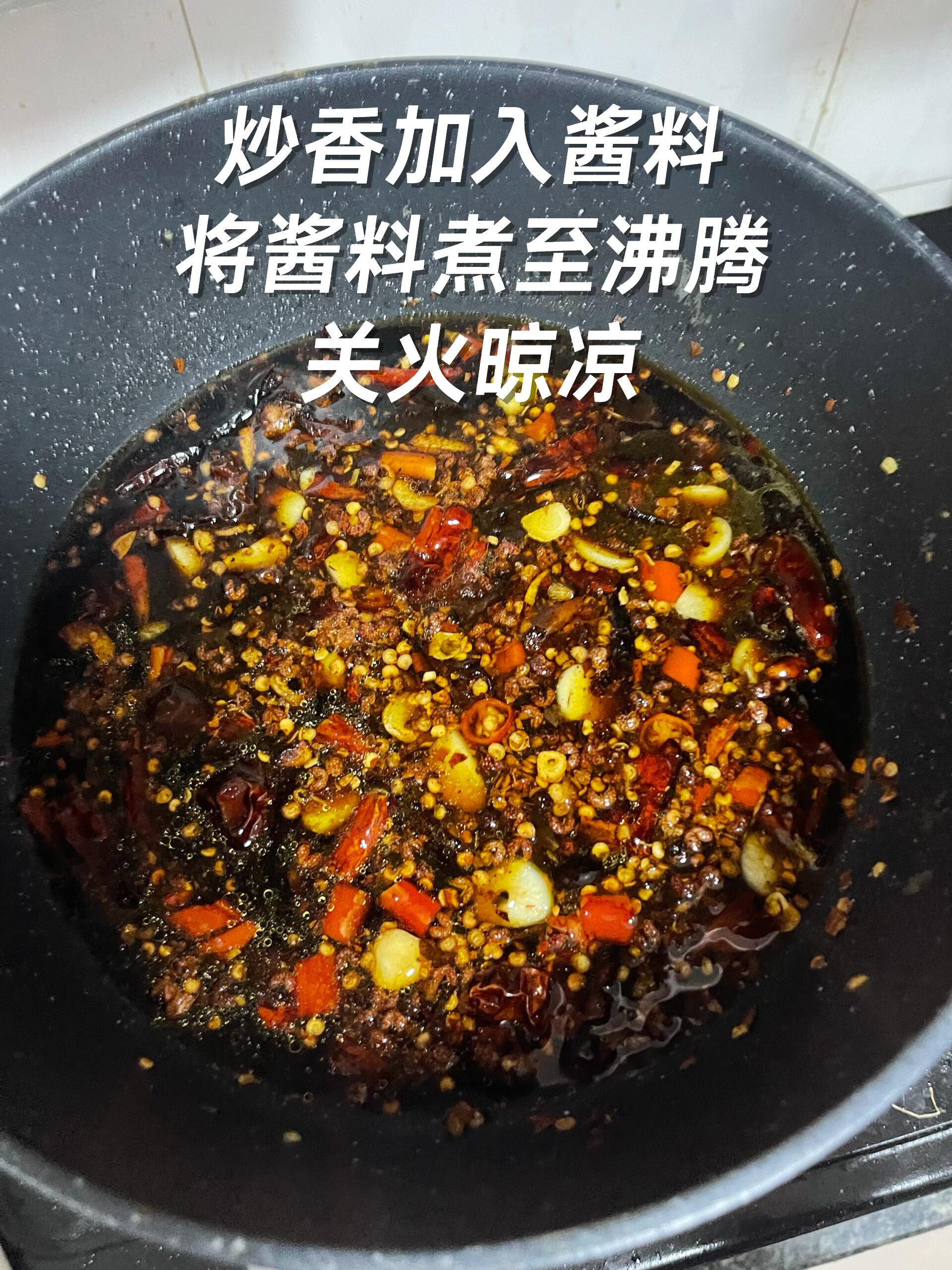 3️⃣ 炒香后,倒入调好的料汁,煮至沸腾(记得搅拌,很快就好),煮好后关火晾凉。