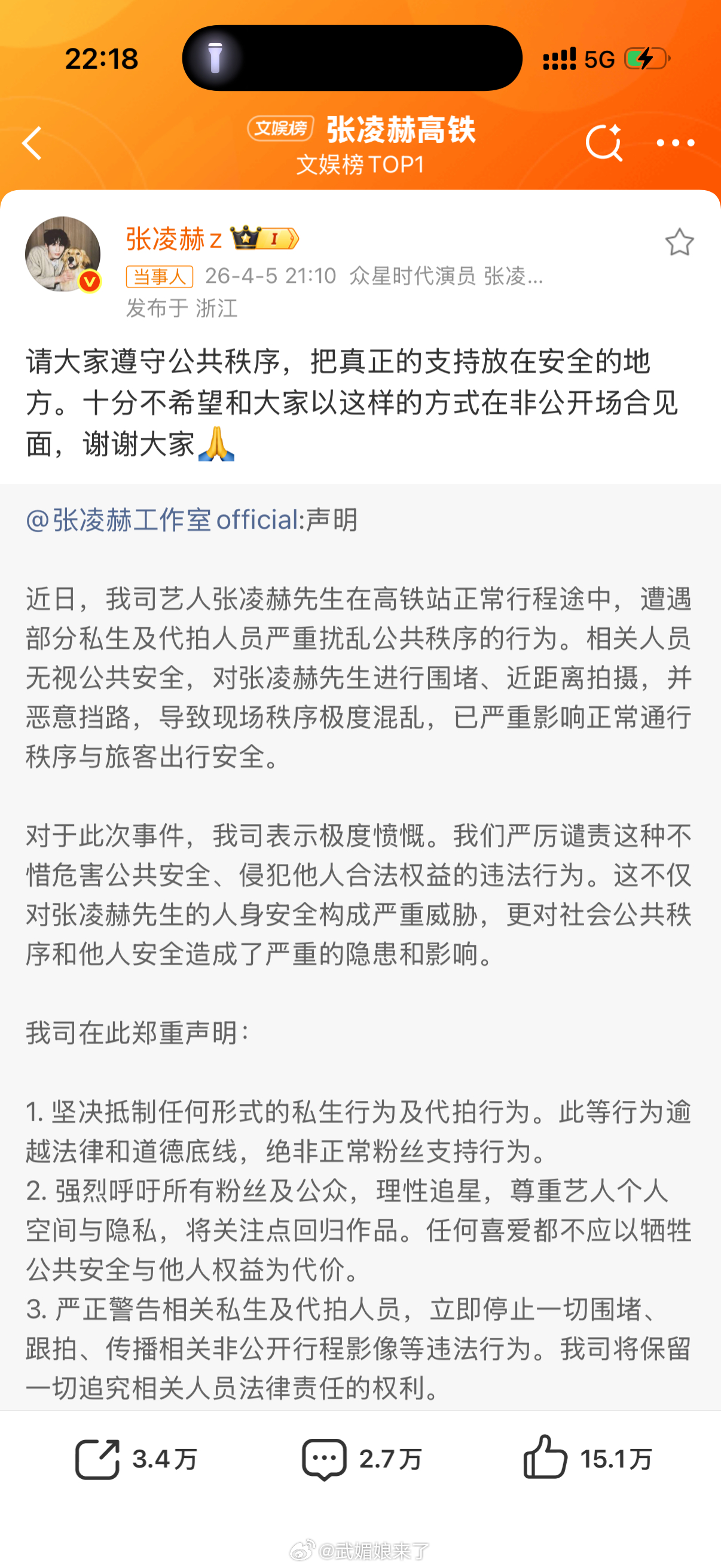 张凌赫高铁张凌赫因赶高铁被SS及代拍围堵发声抵制SS!支持张凌赫,理智追星,私生真的太过分了!